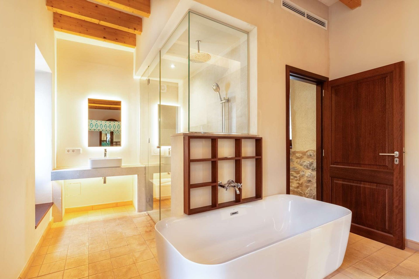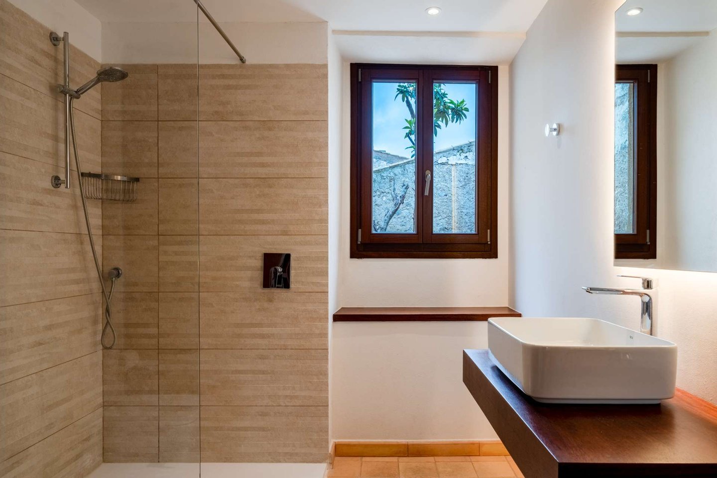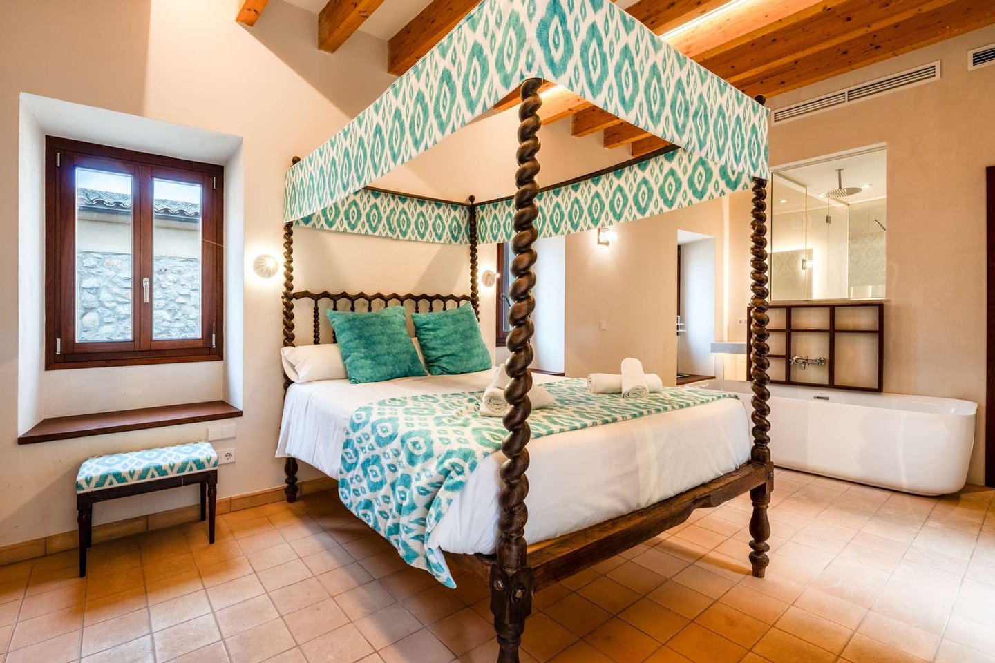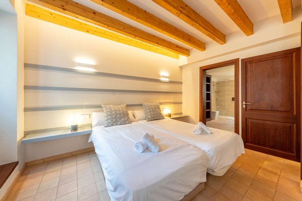 In den oberen Etagen verteilen sich insgesamt fünf Doppelzimmer sowie eine großzügige Suite, alle mit eigenem Bad und Ankleidebereich. Eine große Dachterrasse bietet einen schönen Blick über die Dächer von Artà bis hin zum Castell de Sant Salvador.