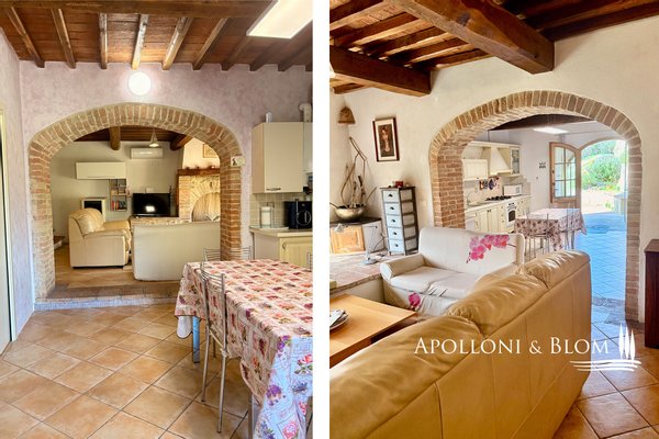 Erdgeschoss: Eingang von der Terrasse in Terrakotta gepflastert, offenes Wohnzimmer mit Küche, zentrale Backsteinbogen, Wohnzimmer mit Kamin und Fenster mit Blick ...mehr lesen