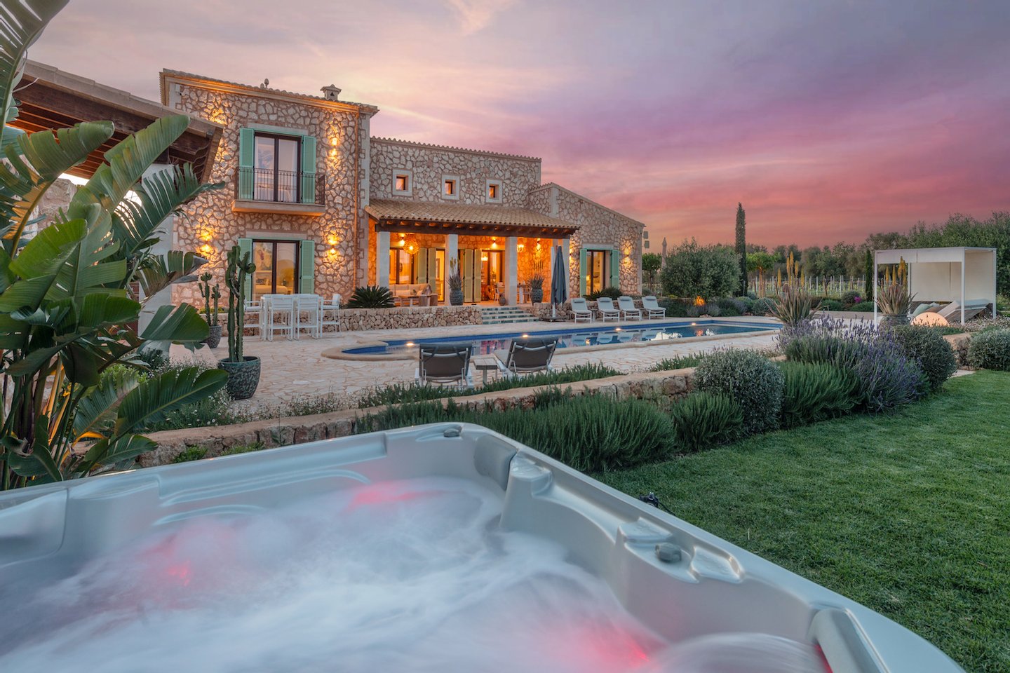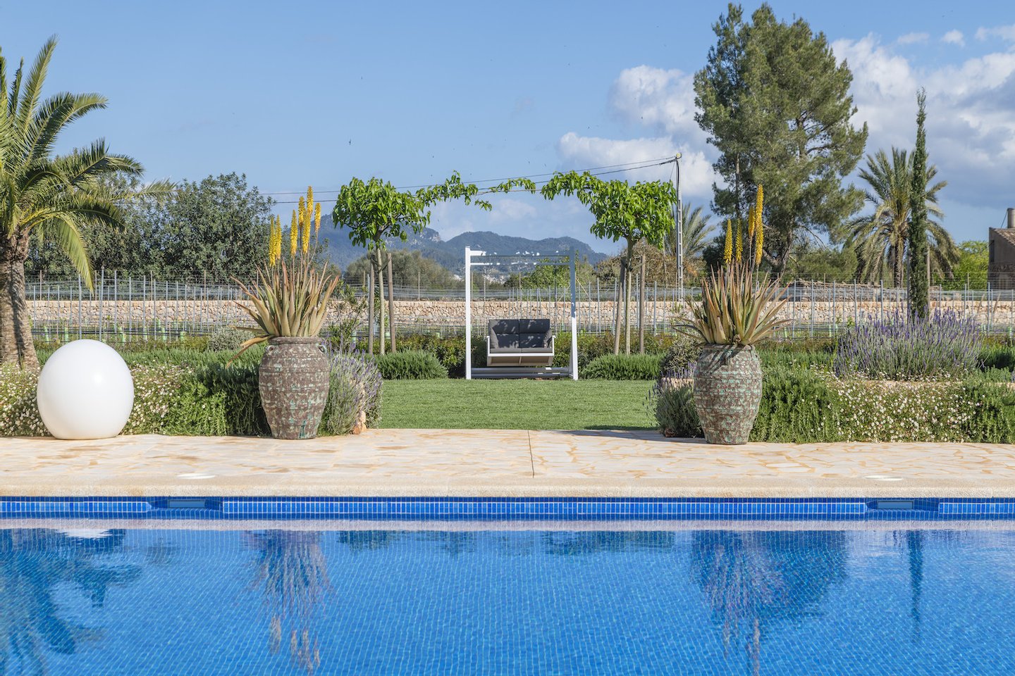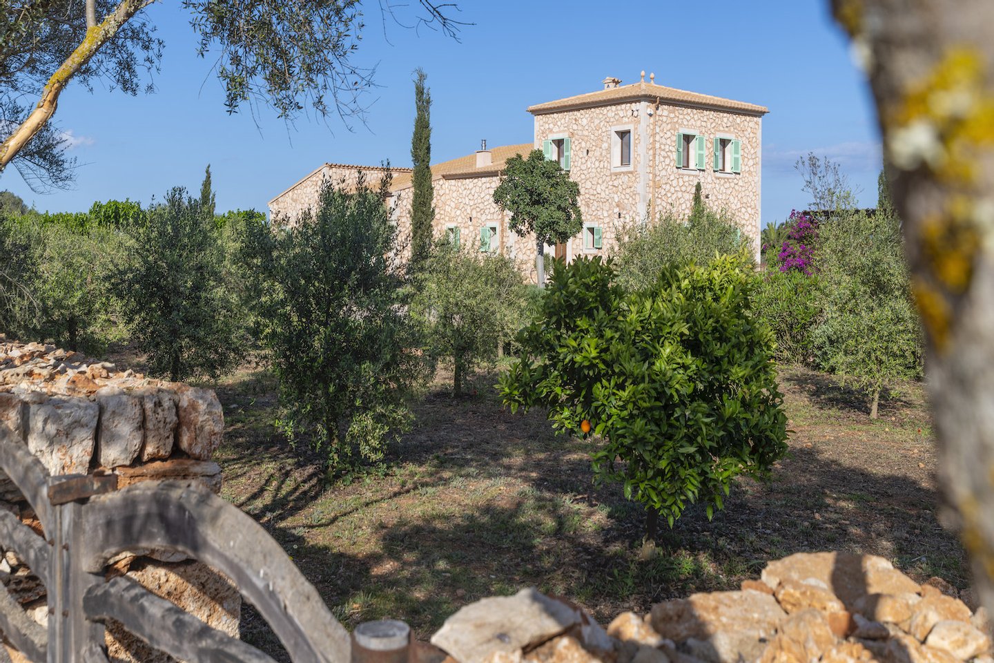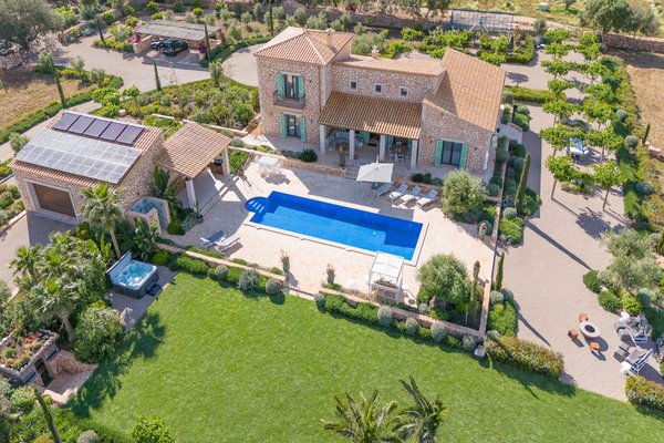 Das rund 18.000 qm große Grundstück beeindruckt mit einem liebevoll angelegten mediterranen Garten, einem eigenen Weinberg mit 2.460 Reben sowie offenen Blicken in die umliegende Landschaft bis hin zum Sant Salvador. Unterschiedliche Terrassen- und Rückzugsbereiche, schattige Plätze unter alten Bäumen, ein Lagerfeuerplatz und eine Boule-Bahn schaffen ein stilvolles Outdoor-Ambiente.