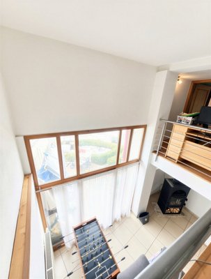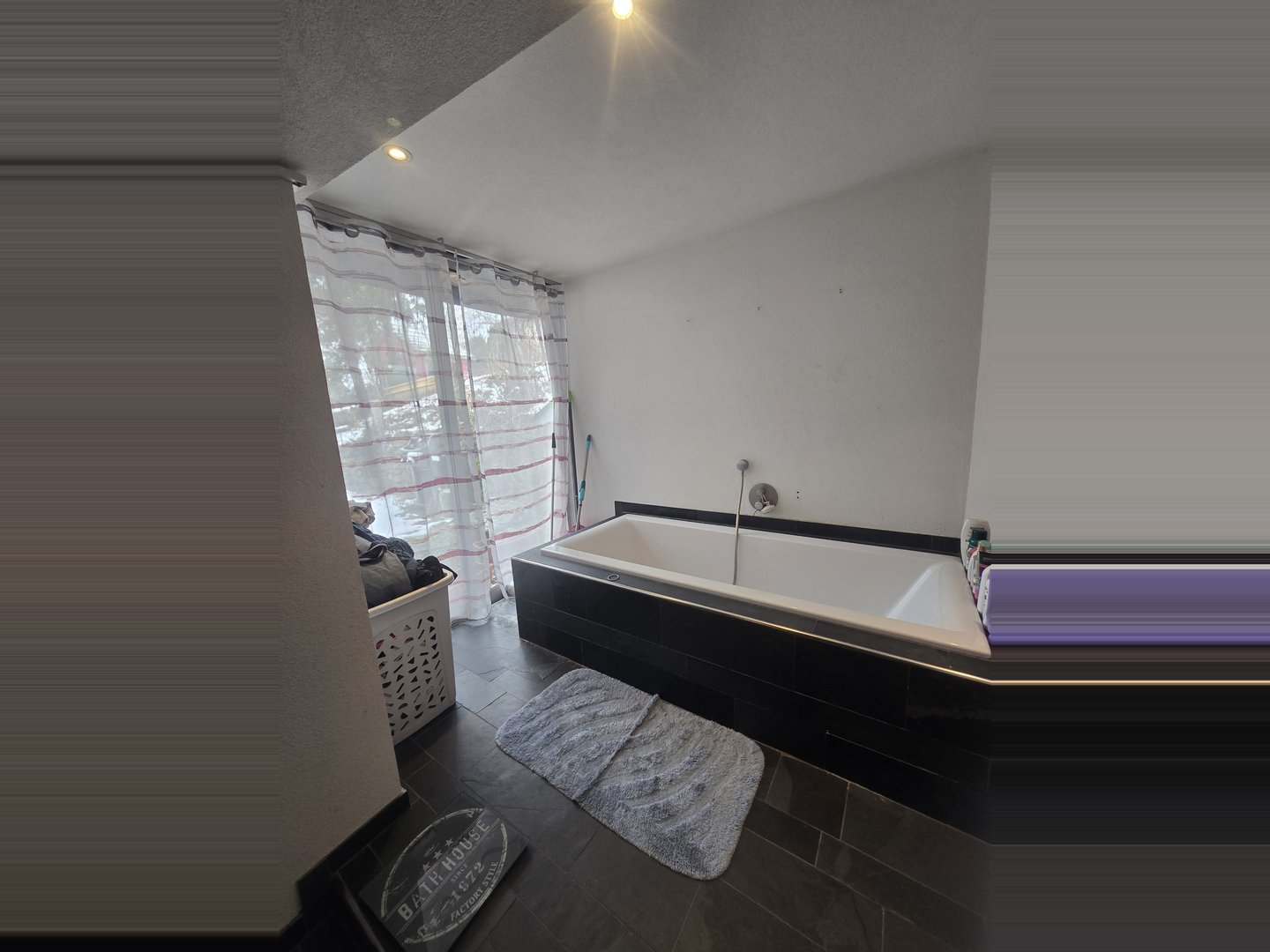 Ein hochwertiges Badezimmer mit großer Wanne und begehbarer Dusche in edlem Schieferdesign sorgt für Wellness‑Atmosphäre. Im Zwischengeschoss befinden sich ein Durchgangszimmer – ideal als Homeoffice oder Spielzimmer – sowie ein weiteres gemütliches Zimmer. Eine große Westterrasse bietet Potenzial für einen Wintergarten.