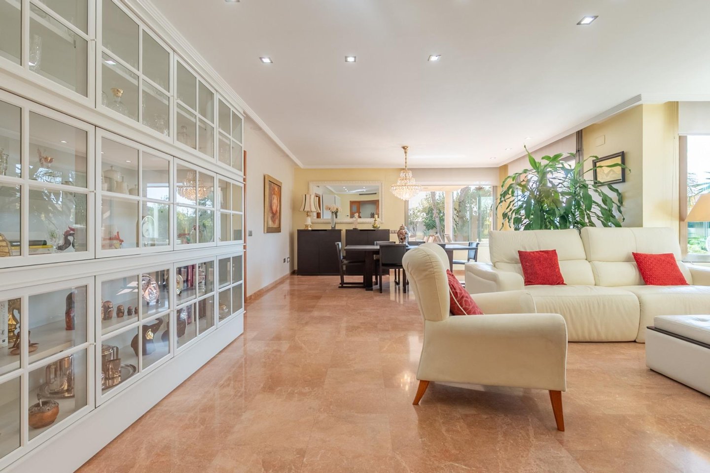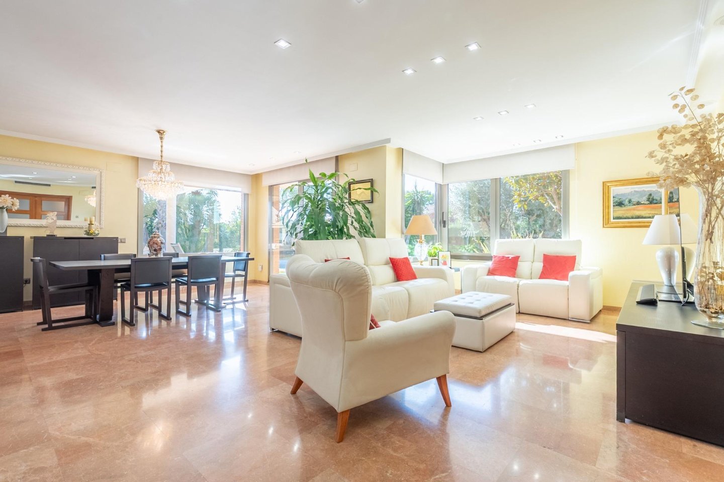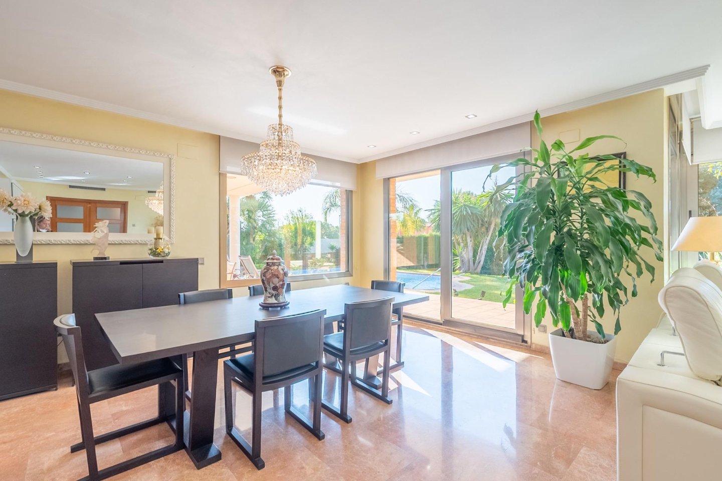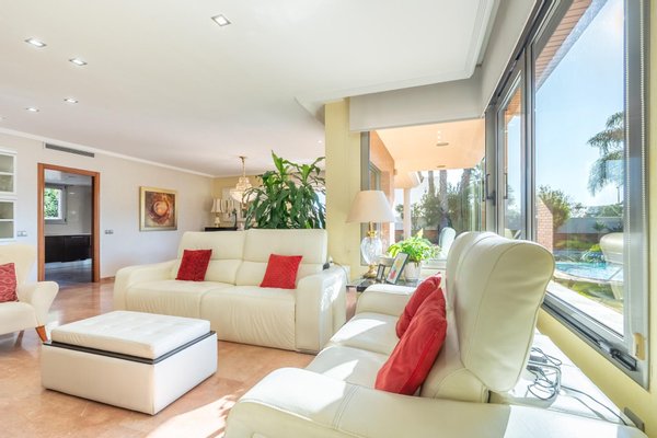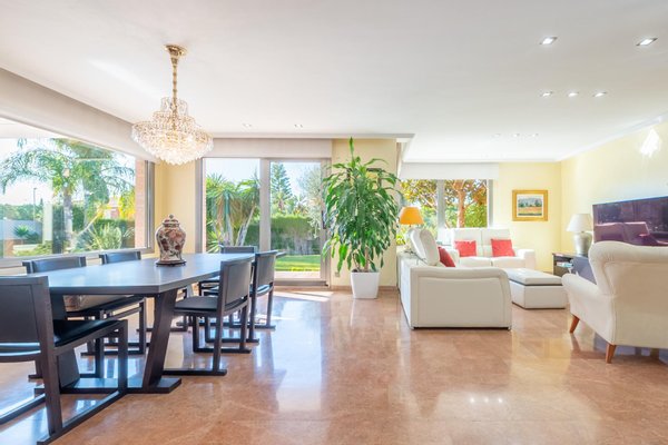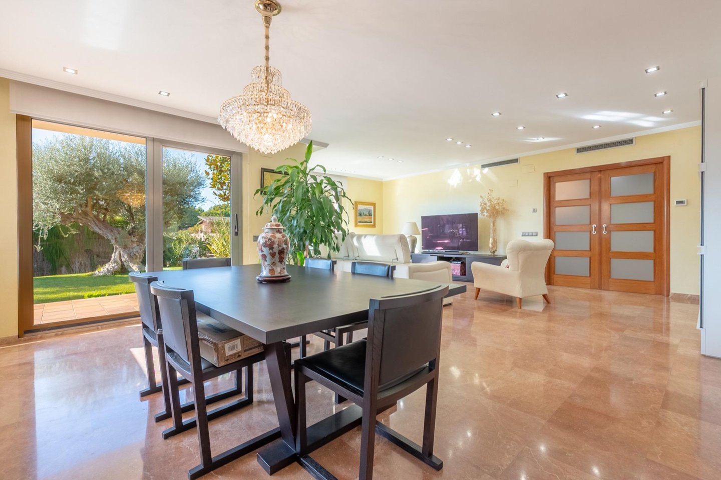 Großem Wohn-Esszimmer mit direktem Zugang zum Garten und zum Pool.