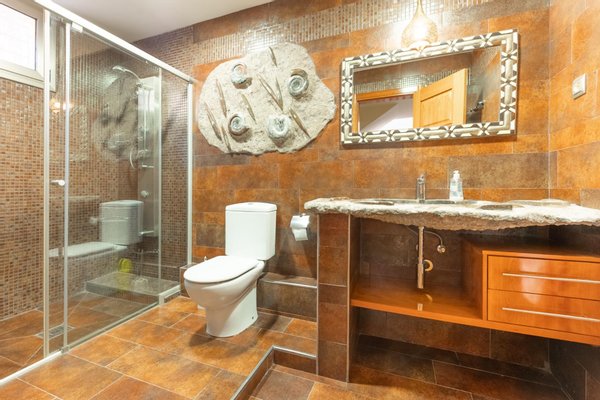 Komplettes Außenbadezimmer, ideal für die Nutzung im Poolbereich.
