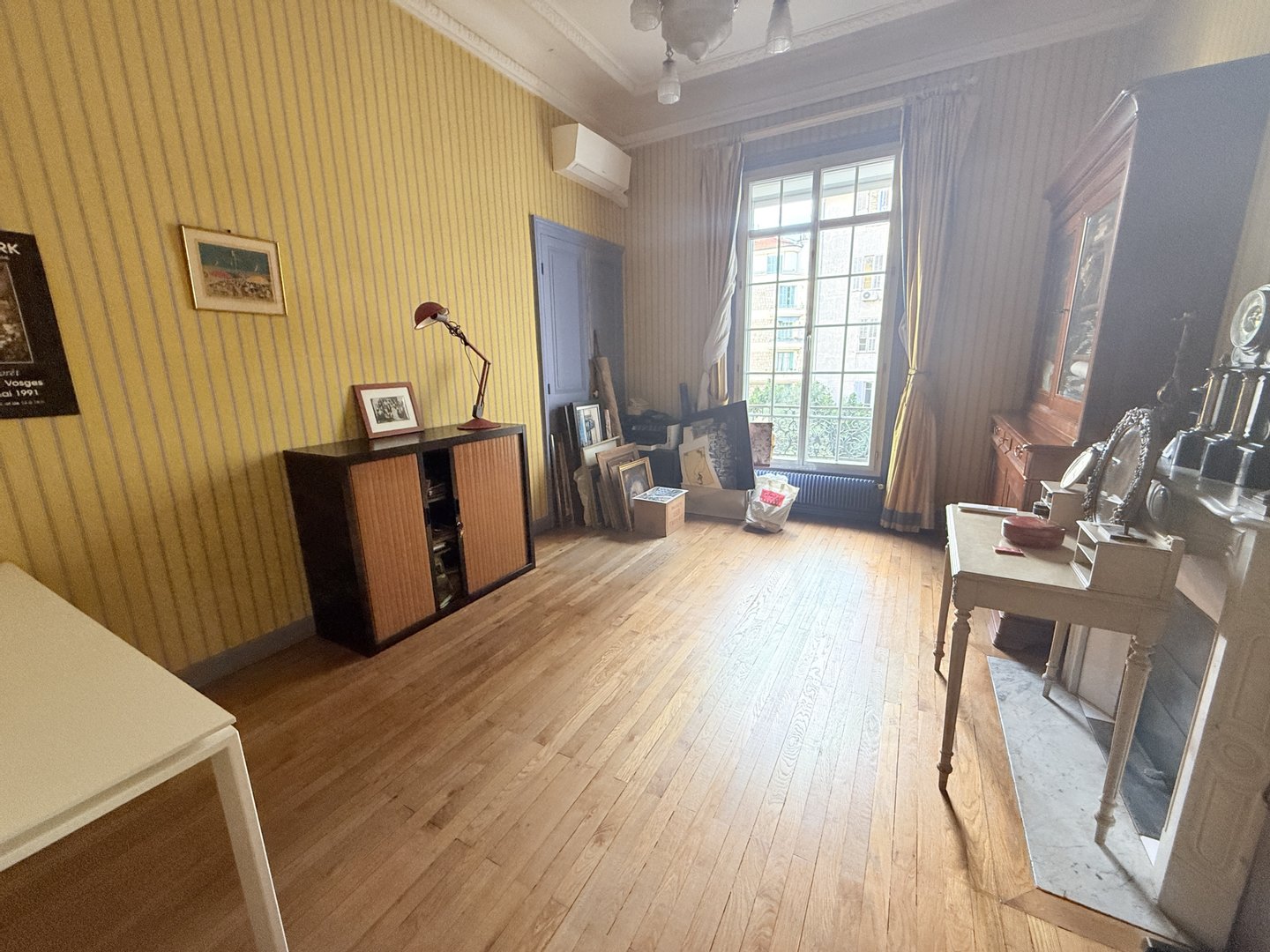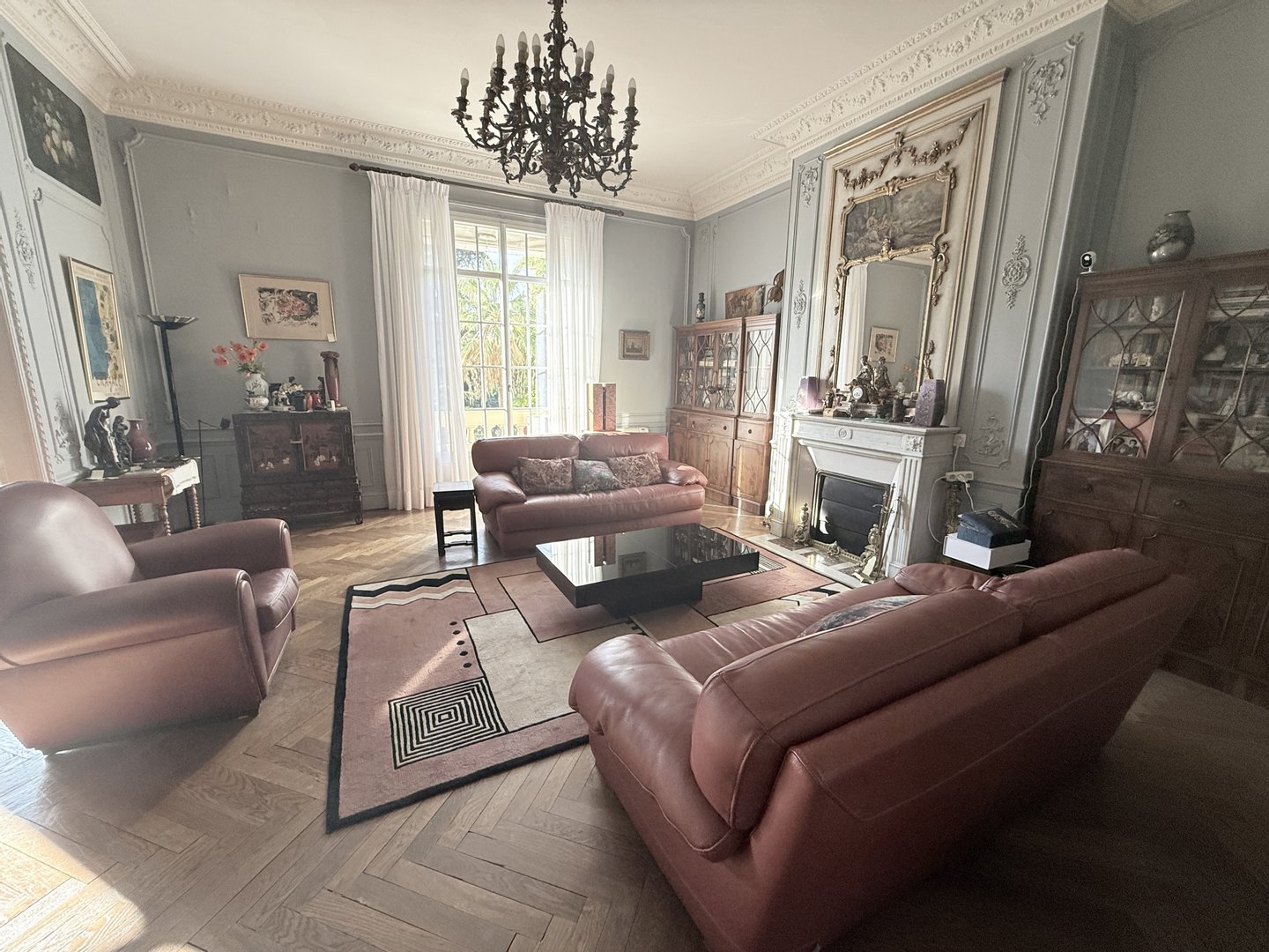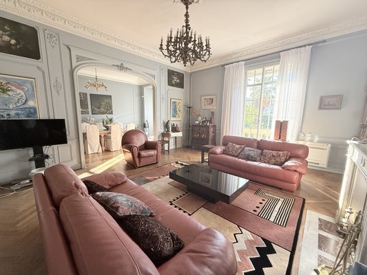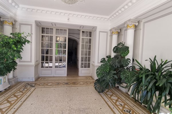 In diesem Empfangsraum fällt der Blick sofort auf einen bemerkenswerten Marmorkamin, der von einem reich dekorierten Trumeau gekrönt wird, einem wahren Herzstück des Raumes. Darum herum zeugen die fein geschnitzten Stucksteine, dekorativen Wandpaneele und eleganten Fresken, die die Wände schmücken, von der Sorgfalt der Innenarchitektur und erinnern an die Raffinesse der großen bürgerlichen Wohnungen der Riviera. Die hohen Decken, verstärkt durch einen Kronleuchter aus der Zeit, verstärken den Eindruck von Prestige und Eleganz zusätzlich.