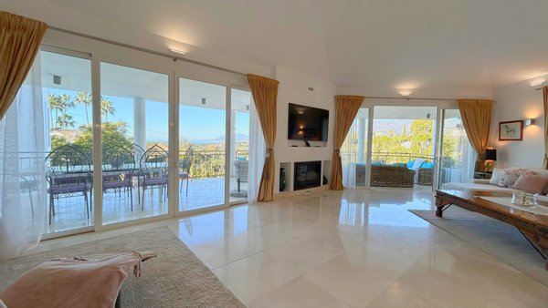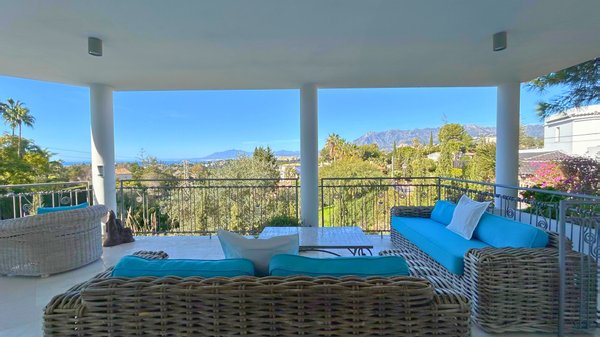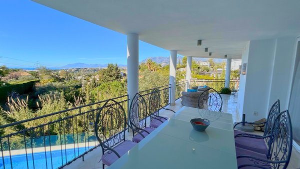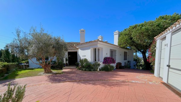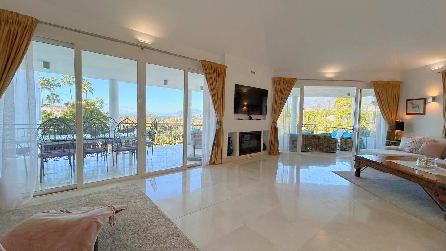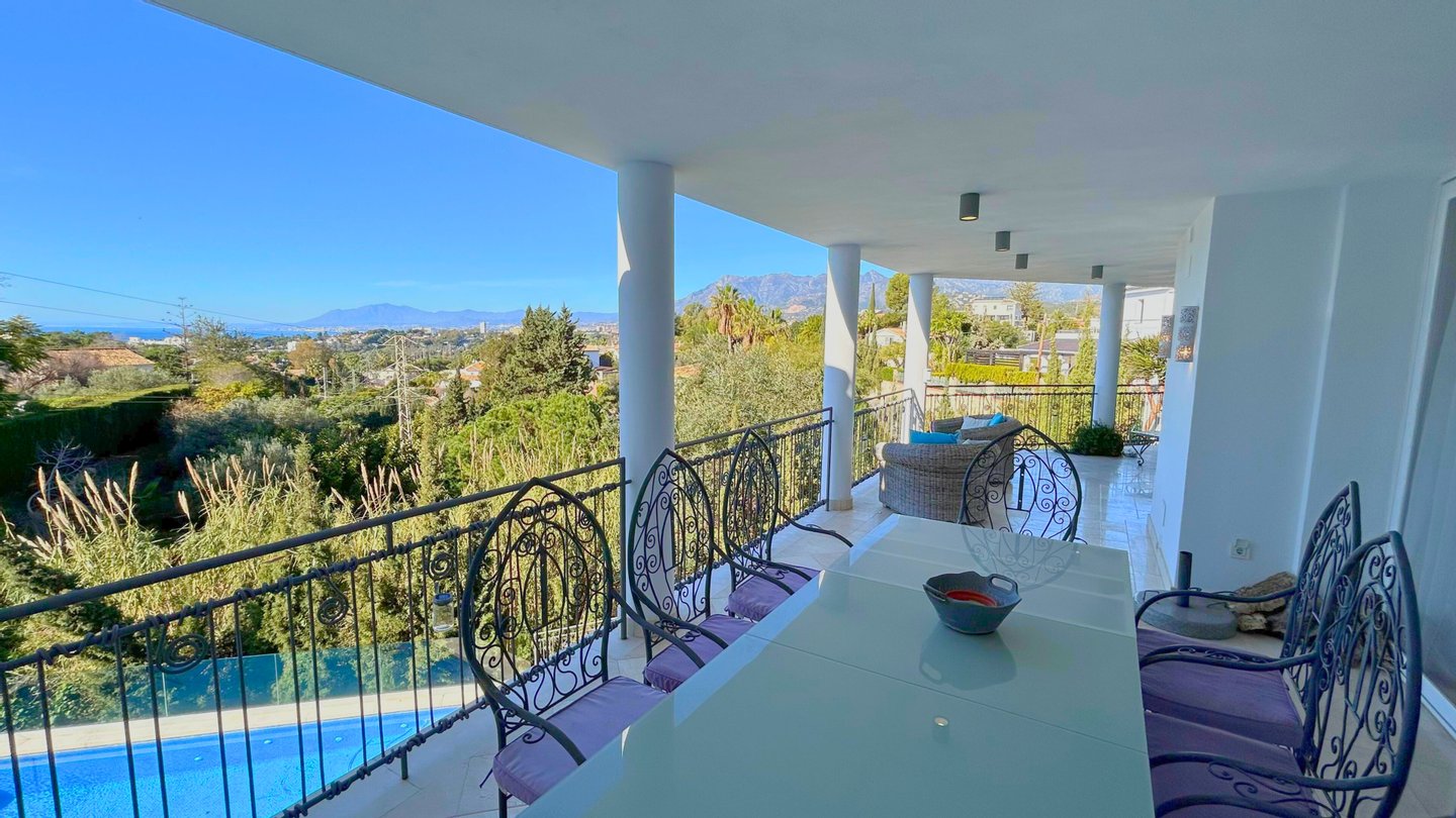 Eine außergewöhnliche, vom Architekt entworfene Villa in einer erhöhten, privilegierten Lage innerhalb der exklusiven, bewachten Gemeinde El Rosario in Ost-Marbella, mit atemberaubendem, ungehindertem, nach Südwesten ausgerichtetem Panoramablick auf Meer und Berge.