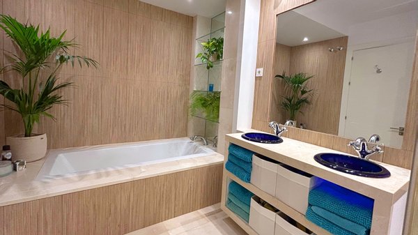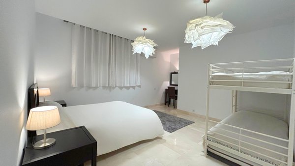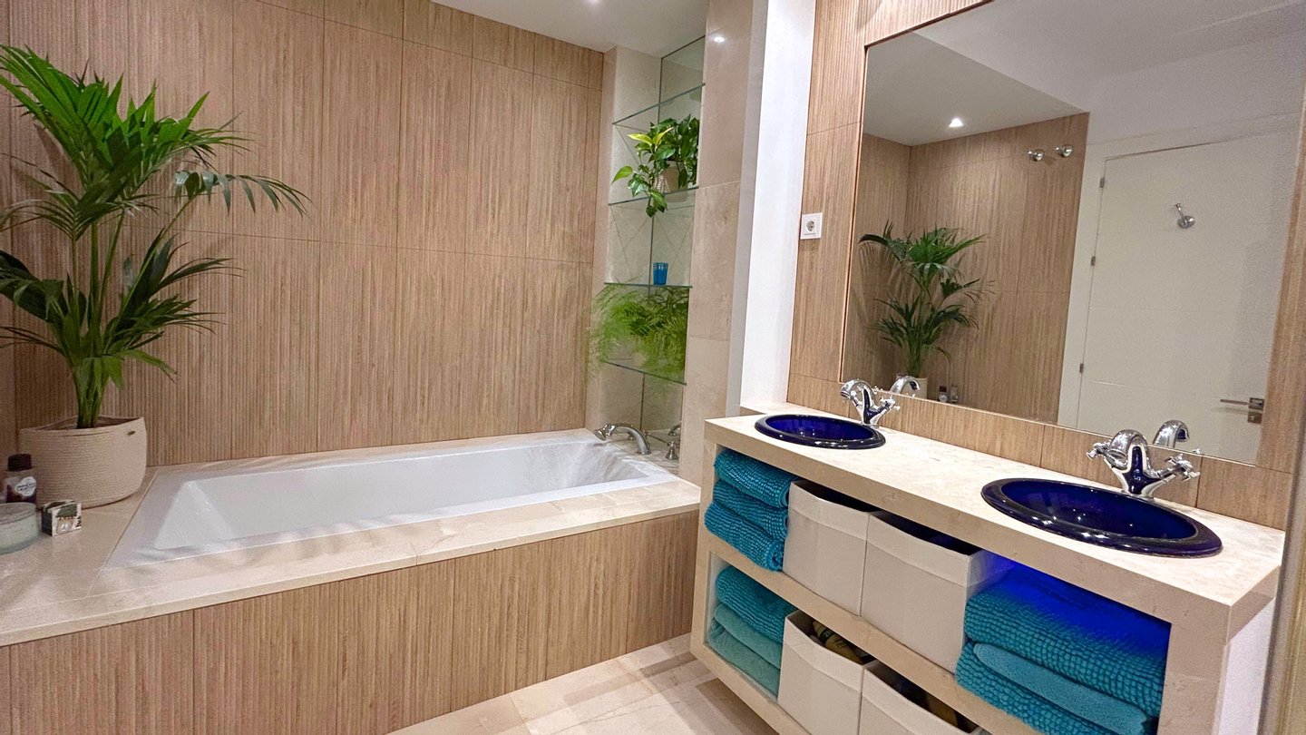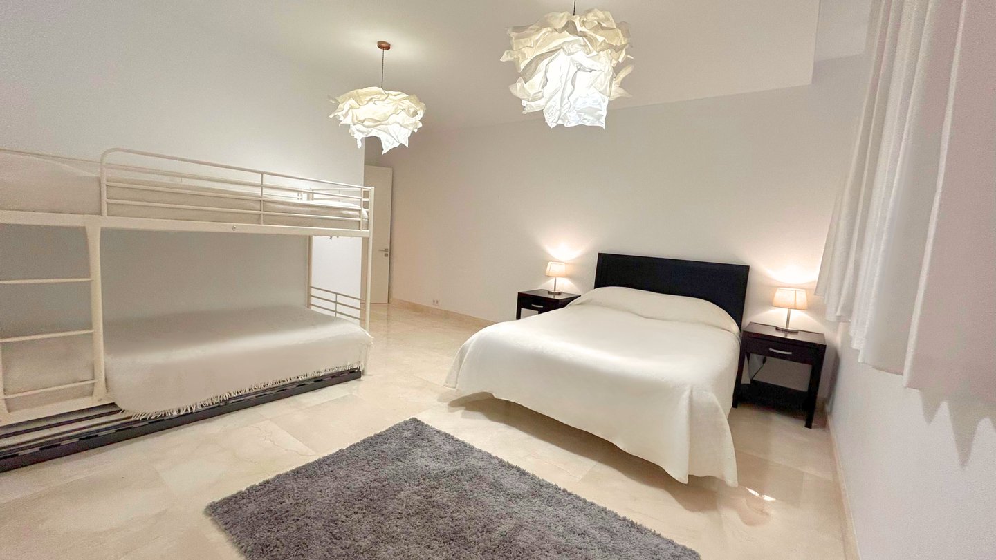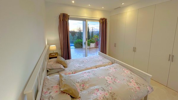 Im Untergeschoss befinden sich vier Schlafzimmer und drei Badezimmer – zwei davon mit eigenem Bad. Die Master-Suite bietet großzügige Proportionen, Zugang zur Terrasse und ein wunderschön gestaltetes ensuite-Bad. In den Schlafzimmern und Fluren gibt es reichlich Einbauschränke. Drei Schlafzimmer haben direkten Zugang zur unteren Terrasse, zum Garten und zum privaten Pool.