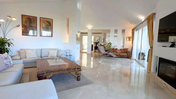 Auf einem großzügigen Grundstück von 1.000 m² mit einer Gesamtfläche von 508,06 m² bietet diese einzigartige Villa zeitgemäße Innenräume und geräumige Zimmergrößen. Es verfügt über eine großzügige, offene Eingangshalle und einen Hauptwohnbereich mit hochwertigem Marmorboden, gewölbter Decke und integriertem Kamin. Es gibt reichlich Tageslicht durch die großen Schiebetüren, die direkt auf große Terrassen führen, die für das mediterrane Leben im Freien konzipiert sind.