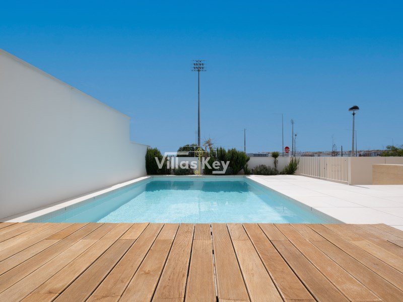 Diese prächtige moderne Villa mit drei Schlafzimmern zum Verkauf in Lagos ist ein herausragendes Beispiel für zeitgenössische Architektur an der Algarve. Jedes Detail wurde sorgfältig geplant, um ein anspruchsvolles Wohnerlebnis zu bieten, beginnend mit dem Außenbereich, wo ein bezaubernder Innenhof die Bewohner zum Haupteingang und einer privaten Garage für zwei Fahrzeuge führt. Dieser Parkraum besticht durch seine Vielseitigkeit und kann leicht in ein hochwertiges Büro oder ein Kreativstudio umgewandelt werden. Der Außenbereich ist eine wahre Oase der Ruhe, mit einem privaten Pool, der mit glasierten Fliesen verziert und von einem pflegeleichten Deck umgeben ist - ideal, um das sonnige Klima der Region zu genießen.