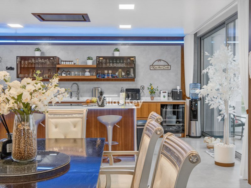 Die Immobilie verfügt über zwei voll ausgestattete Profiküchen mit Mittelinsel, Bosch-Geräten mit Internetsteuerung, sowie eine Außenküche und mehrere Grills.