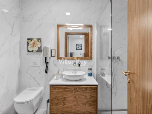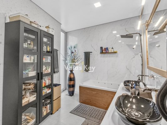 Die fünf Badezimmer (zwei in Schwarz, drei in Weiß) sind mit Walnussmöbeln, integrierten Haartrocknern und Bodentransportsystemen ausgestattet. Das Hauptbad enthält eine Whirlwanne mit Beleuchtung.