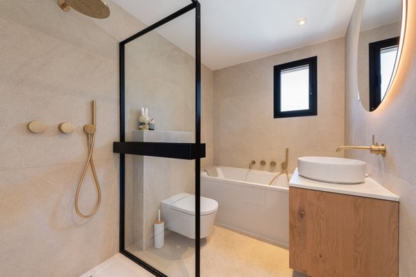 Das Erdgeschoss umfasst eine private Garage mit automatischem Tor, in der alle technischen Anlagen untergebracht sind, darunter ein 270-Liter-Warmwasserboiler, eine Fußbodenheizung, ein Wasserenthärter und ein Waschraum. Auf dieser Ebene befinden sich auch eine Gästetoilette und ein Abstellraum. Der zentrale Wohnbereich verfügt über eine luxuriöse offene Küche mit Kochinsel, einen Essbereich und ein gemütliches Wohnzimmer, die alle auf eine geräumige überdachte Terrasse mit elektrischer Markise führen. Die Terrasse führt zum privaten Garten und einem großzügigen Swimmingpool von ca. 11 x 3 Metern, komplett mit Außendusche, Waschbecken und einem eingebauten Grill. Die Legalisierung des Pools ist in Bearbeitung und im Kaufpreis enthalten.