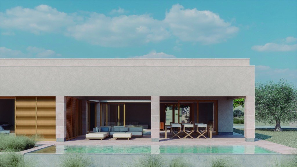 Dieses einstöckige Villenprojekt verfügt über eine beeindruckende Fläche von ca. 286 m² und einen Pool. Es ist so konzipiert, dass es drei Doppelschlafzimmer, zwei Badezimmer, eine geräumige, moderne Küche mit Essbereich, ein großes Wohnzimmer und einen reizvollen Innenhof mit großen Fenstern umfasst, die für viel natürliches Licht im gesamten Haus sorgen.