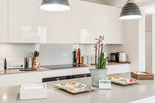 Im Erdgeschoss befinden sich zwei helle Schlafzimmer und zwei Badezimmer, ein großzügiger Wohn- und Essbereich mit viel Tageslicht sowie eine charmante Küche mit Esstisch, perfekt für gemeinsame Mahlzeiten mit Familie und Freunden. Zudem bietet diese Ebene eine Garage, einen Abstellraum, eine überdachte Terrasse mit Grillbereich sowie direkten Zugang zum großen privaten Swimmingpool.