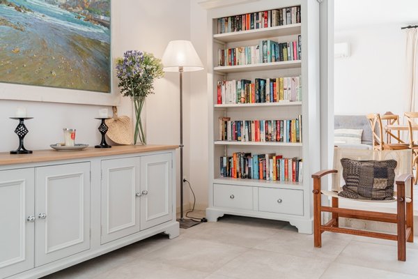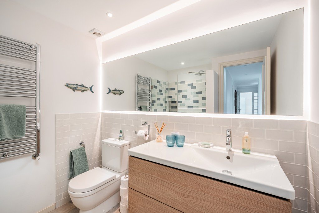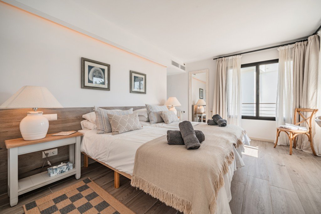 Im Obergeschoss befinden sich zwei weitere Schlafzimmer, jeweils mit eigenem Bad en suite. Beide Schlafzimmer haben Zugang zu einem gemeinsam genutzten privaten Balkon, von dem aus sich ein schöner Blick auf die Bucht von Pollensa genießen lässt. Die Meerblicke bieten sich somit von diesem Balkon im ersten Stock, während die absolute Stärke dieser Immobilie in ihrer unschlagbaren Lage, nur wenige Schritte vom Meer entfernt, liegt.