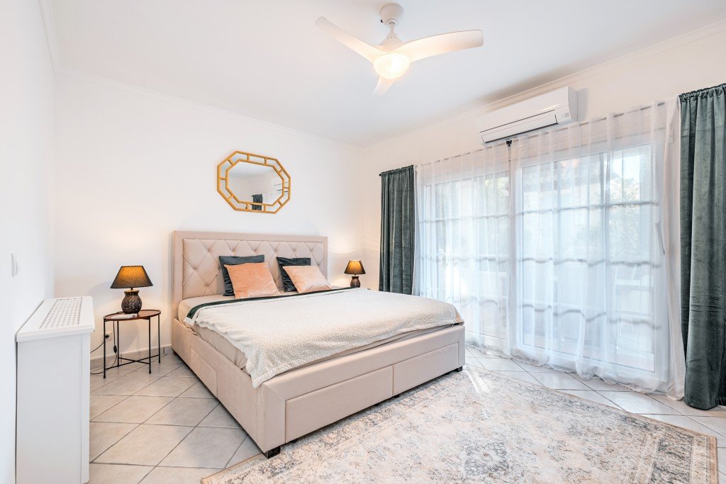Die moderne Einbauküche ist durchdacht gestaltet und komplett ausgestattet, um den täglichen Bedürfnissen gerecht zu werden, während die gefliesten Böden im gesamten Haus eine zeitlose Ästhetik und einfache Pflege bieten. Ein gemütlicher Kamin schafft in den kühleren Monaten eine warme Atmosphäre, ergänzt durch eine Klimaanlage für ein angenehmes Raumklima im Sommer.