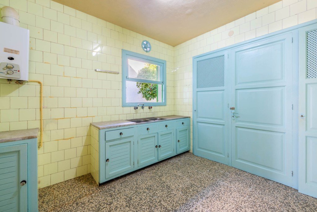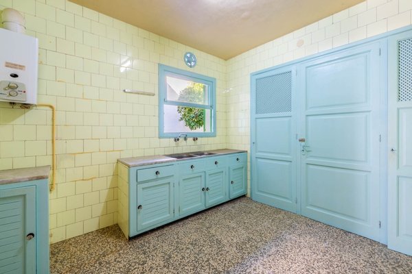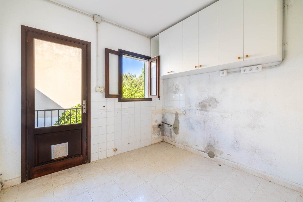 Obwohl das Gebäude renovierungsbedürftig ist, befindet es sich in einem guten Zustand. Die Aufteilung muss noch angepasst werden, aber Sie können problemlos 3-4 Schlafzimmer, ein großes Wohn-Esszimmer und eine möblierte Küche unterbringen. Es gibt sogar eine Garage mit Platz für ein Auto und Stauraum.
