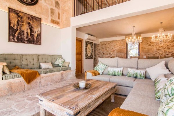Innen bietet die Finca eine stilvolle Ausstattung mit einer hochwertigen Mischung aus rustikalen und modernen Elementen. Sie bietet eine fantastische Raumaufteilung mit großen Schiebetüren, durch die man sowohl vom Wohnzimmer als auch von der Küche aus auf die überdachte Terrasse gelangen kann.