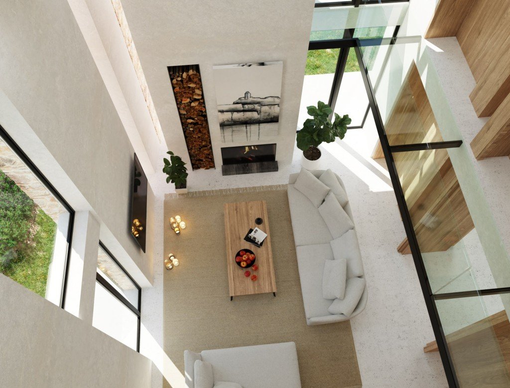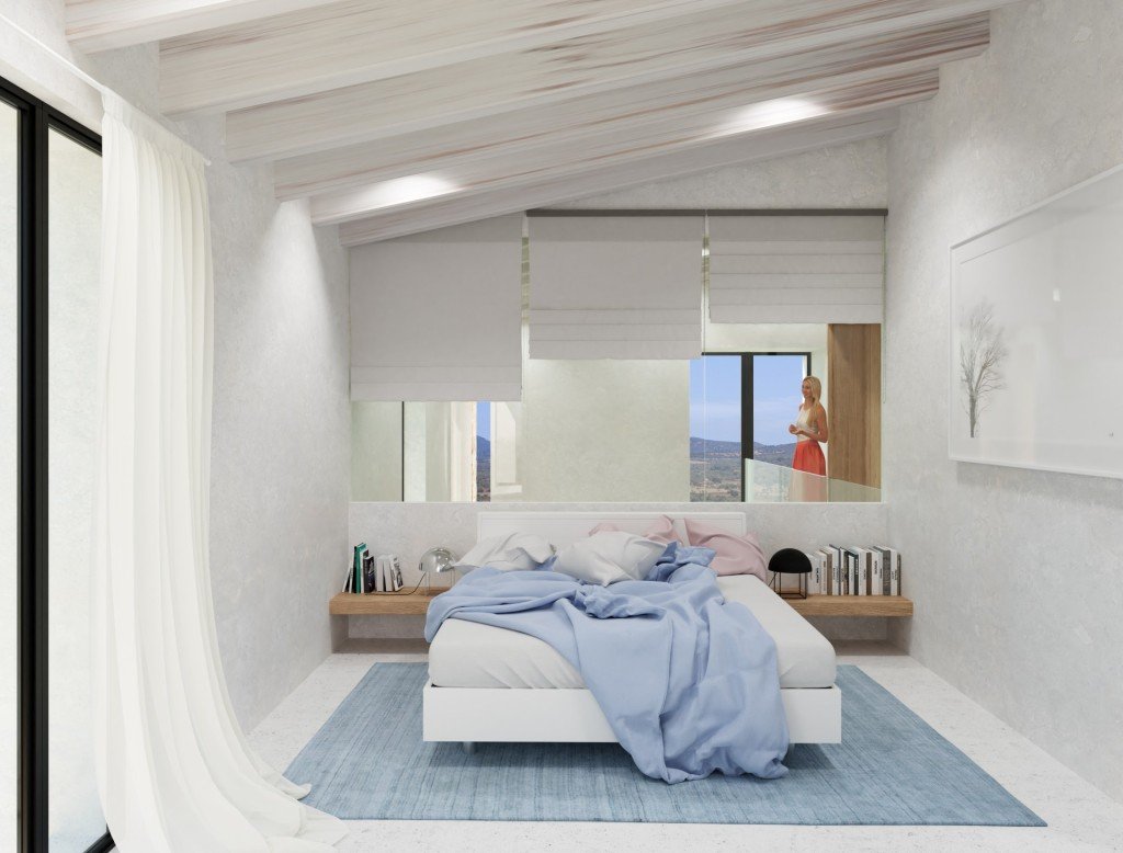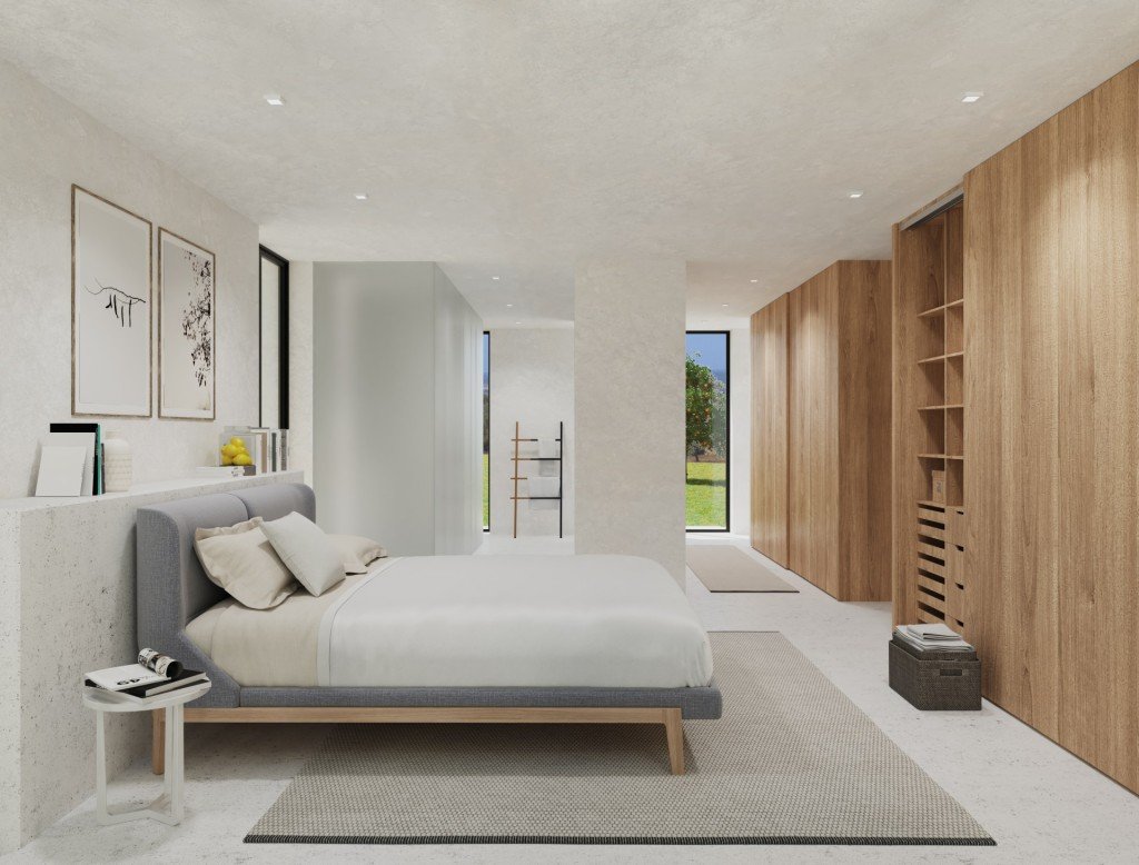 Der geplante Grundriss erstreckt sich über zwei Etagen und umfasst vier Schlafzimmer, vier Badezimmer und ein zusätzliches Gäste-WC. Die großen Innenräume sind so gestaltet, dass sie möglichst viel Tageslicht hereinlassen, und es sind bereits Vorkehrungen für eine Waschküche und eine Speisekammer getroffen worden. Ein 15 Meter langer Swimmingpool ist bereits vorhanden, ebenso wie großzügige Außenparkplätze für mehrere Fahrzeuge. Die Fenster sind noch nicht eingebaut, was Flexibilität bei der Gestaltung und den Materialien bietet, um den endgültigen ästhetischen und komfortablen Anforderungen gerecht zu werden.