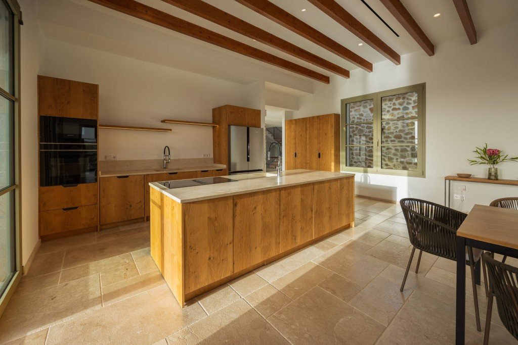 Mit einer konstruierten Fläche von insgesamt 1061 m² überzeugt die Residenz durch ihre anspruchsvolle Architektur, großzügige Raumproportionen und die nahtlose Verbindung zwischen Innen- und Außenbereichen. Hohe Decken mit sichtbaren Holzbalken unterstreichen das Gefühl von Weite und Eleganz. Das Herzstück des Hauses bildet der großzügige, offen gestaltete Wohnbereich mit Wohnzimmer, Essbereich und einer maßgefertigten Designerküche mit Kochinsel. Großzügige Fensterfronten durchfluten die Räume mit Tageslicht und öffnen sich direkt zu den Terrassen.