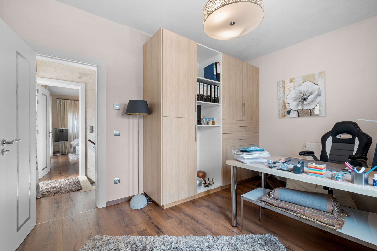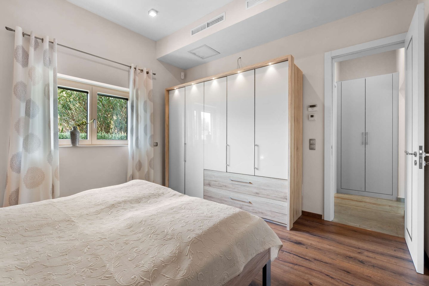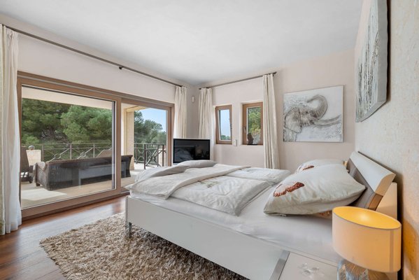 Das Obergeschoss ist dem privaten Rückzugsbereich gewidmet und beherbergt das Master-Schlafzimmer mit eigenem Bad, Ankleidebereich und Zugang zu einer außergewöhnlich großen Terrasse. Von hier aus genießen Sie einen weiten Blick bis hin zum Meer und zur Insel Cabrera. Ein weiteres Schlafzimmer im Obergeschoss eignet sich flexibel auch als Büro oder Gästezimmer.