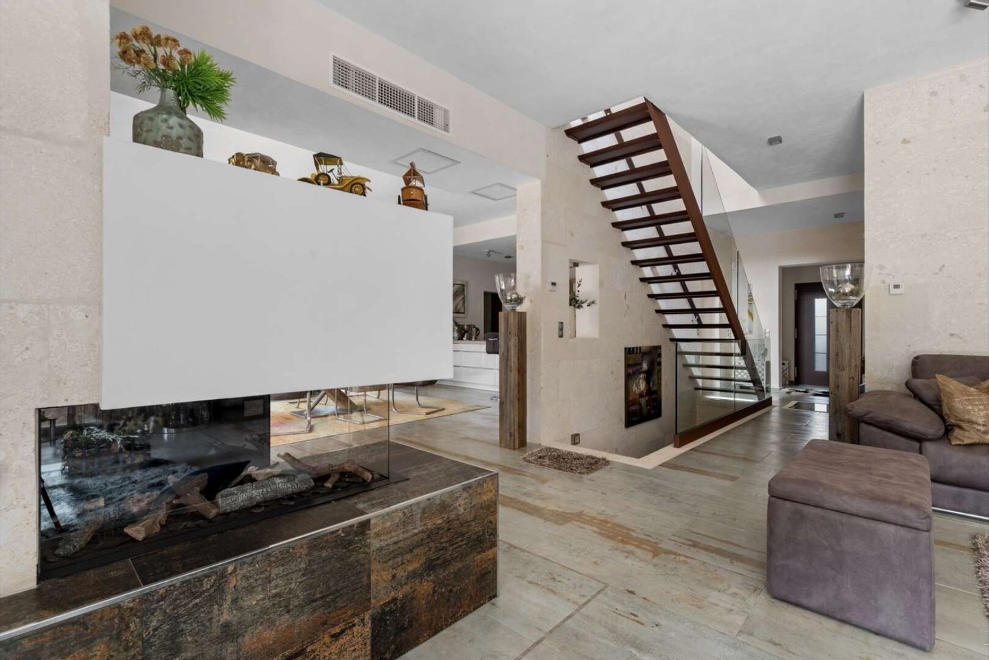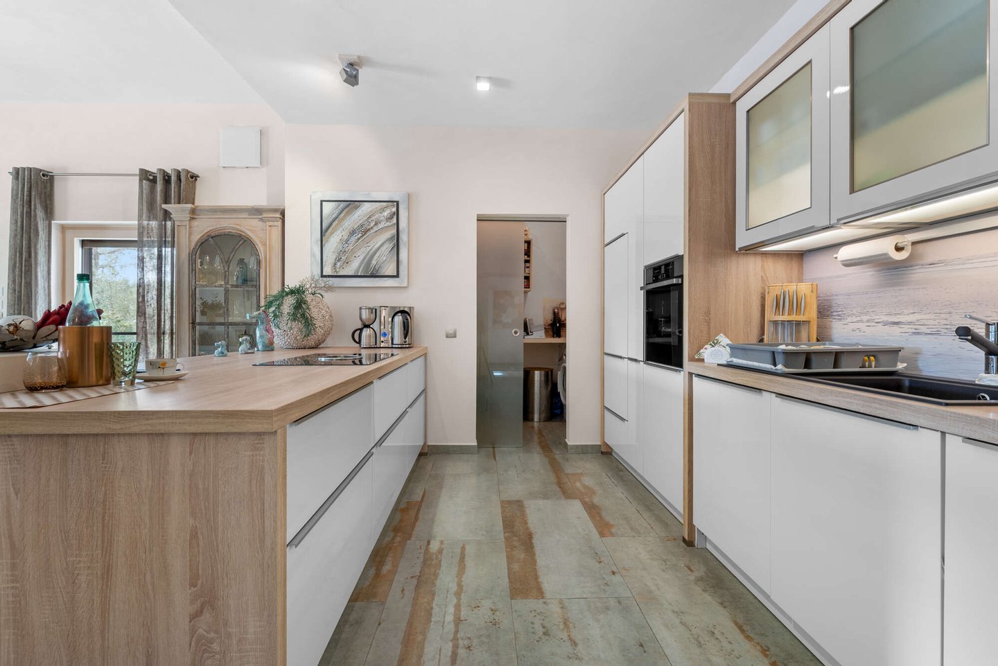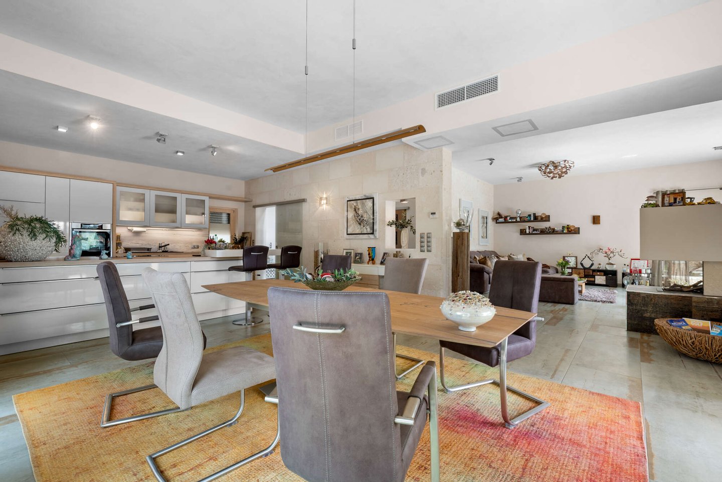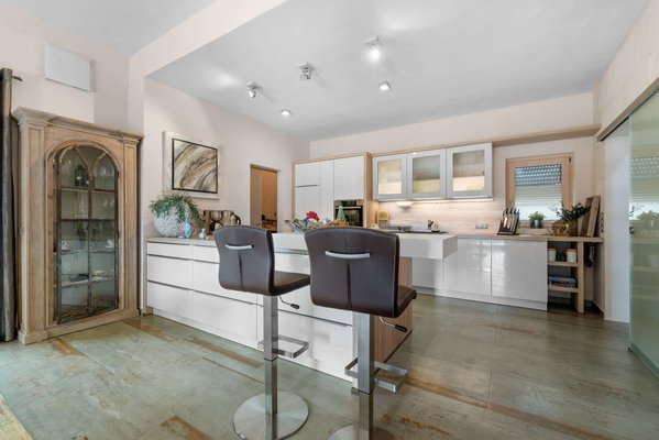 Der offen gestaltete Wohnbereich erstreckt sich über das Erdgeschoss und verbindet Küche, Essbereich und Wohnzimmer zu einer harmonischen Einheit. Großzügige Fensterfronten sorgen für viel Tageslicht und schaffen fließende Übergänge zwischen Innen- und Außenbereich. Hochwertige Materialien, Sicherheitsausstattung und eine moderne Alarmanlage unterstreichen den gehobenen Anspruch dieser Immobilie.