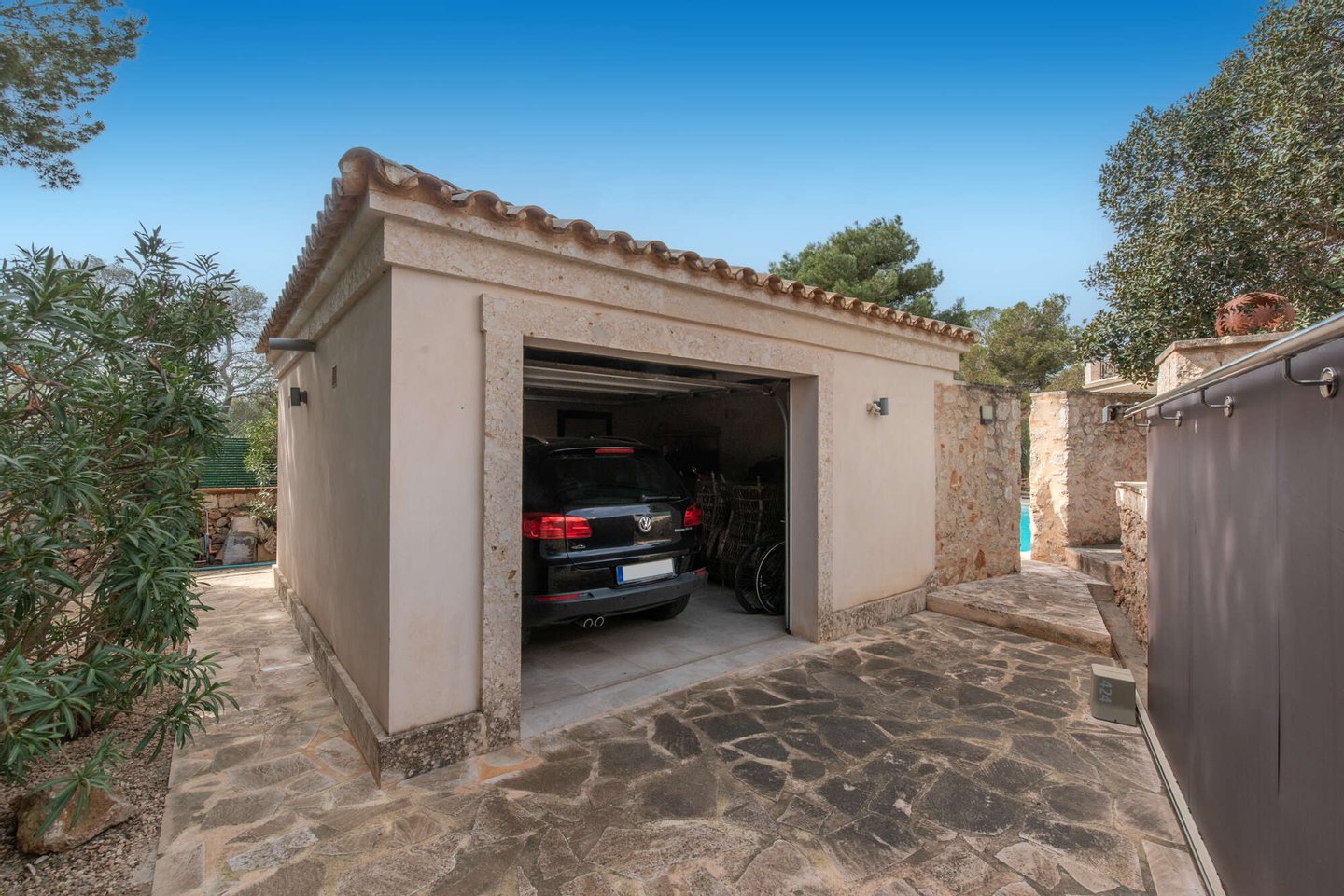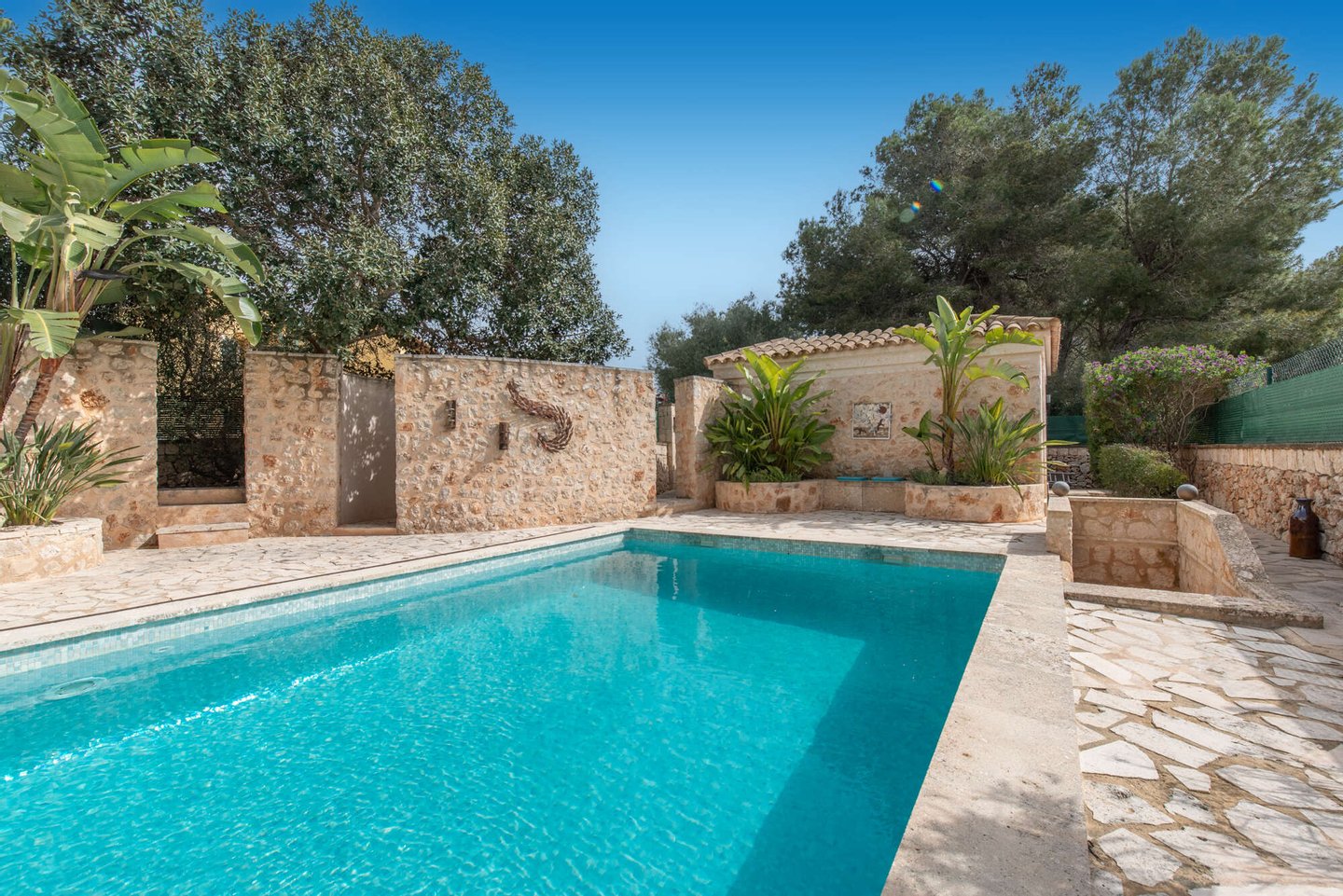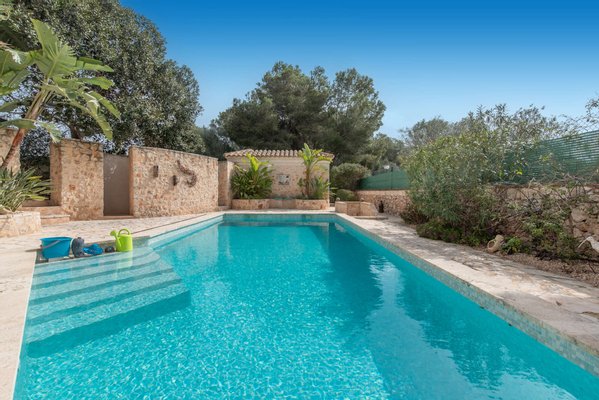 Der liebevoll angelegte Außenbereich mit großzügigem Pool (ca. 10 × 4,5 m) bietet absolute Privatsphäre und ist nicht einsehbar. Mehrere Terrassenbereiche laden zu entspannten Stunden im Freien ein. Traditionelle Natursteinmauern verleihen dem Anwesen seinen authentisch mediterranen Charakter.