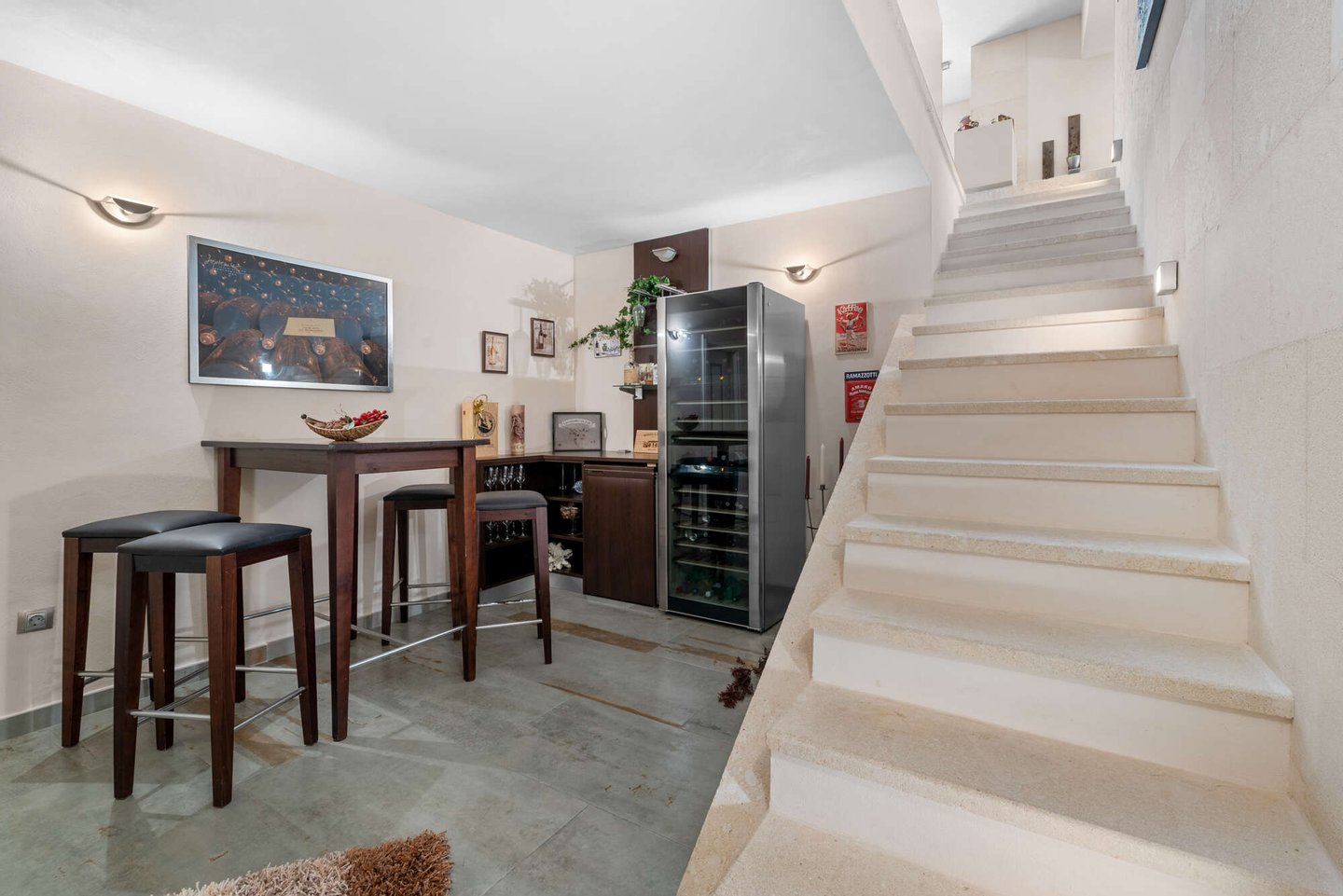 Ein teilunterkellerter Bereich mit Technikraum, Abstellflächen sowie einer stimmungsvollen Wein-Bodega rundet das Gesamtbild dieser besonderen Immobilie ab.
