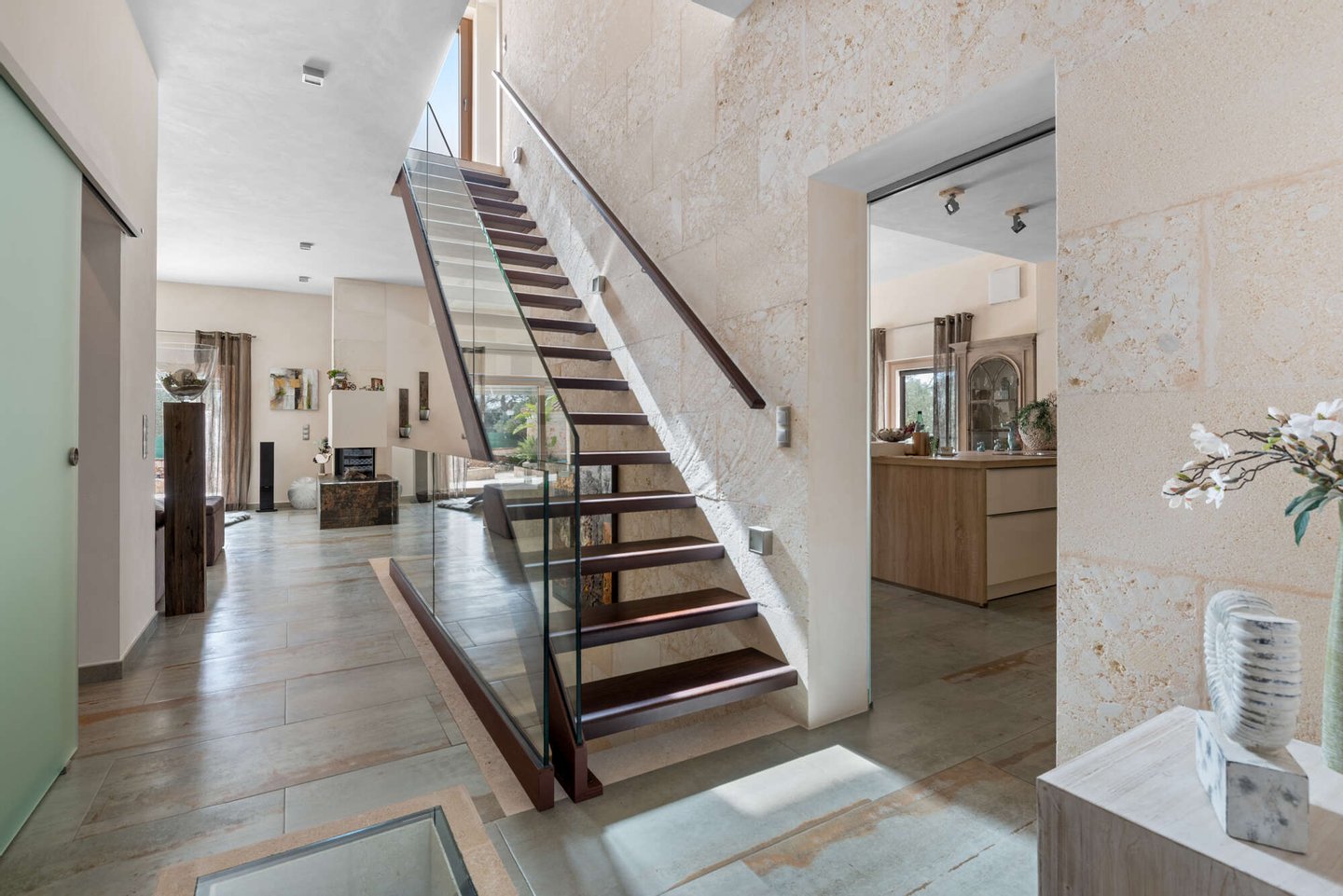 • Teilweise verkleidete Wände mit Naturstein (Mares-Stein)