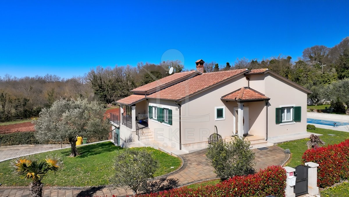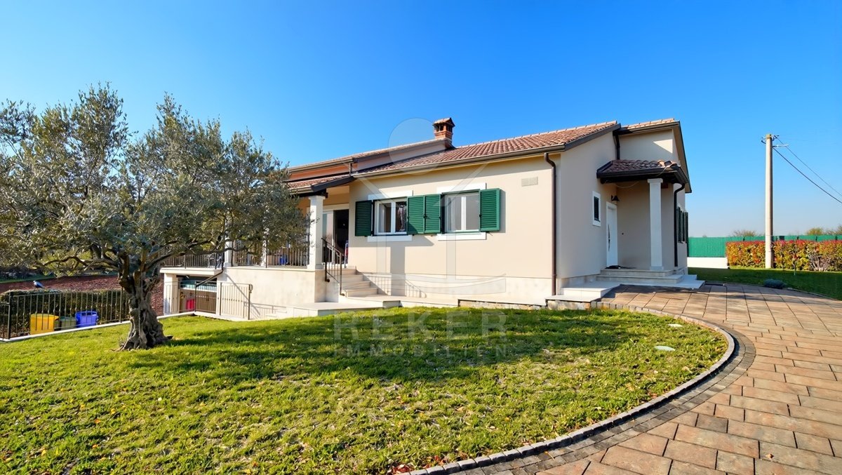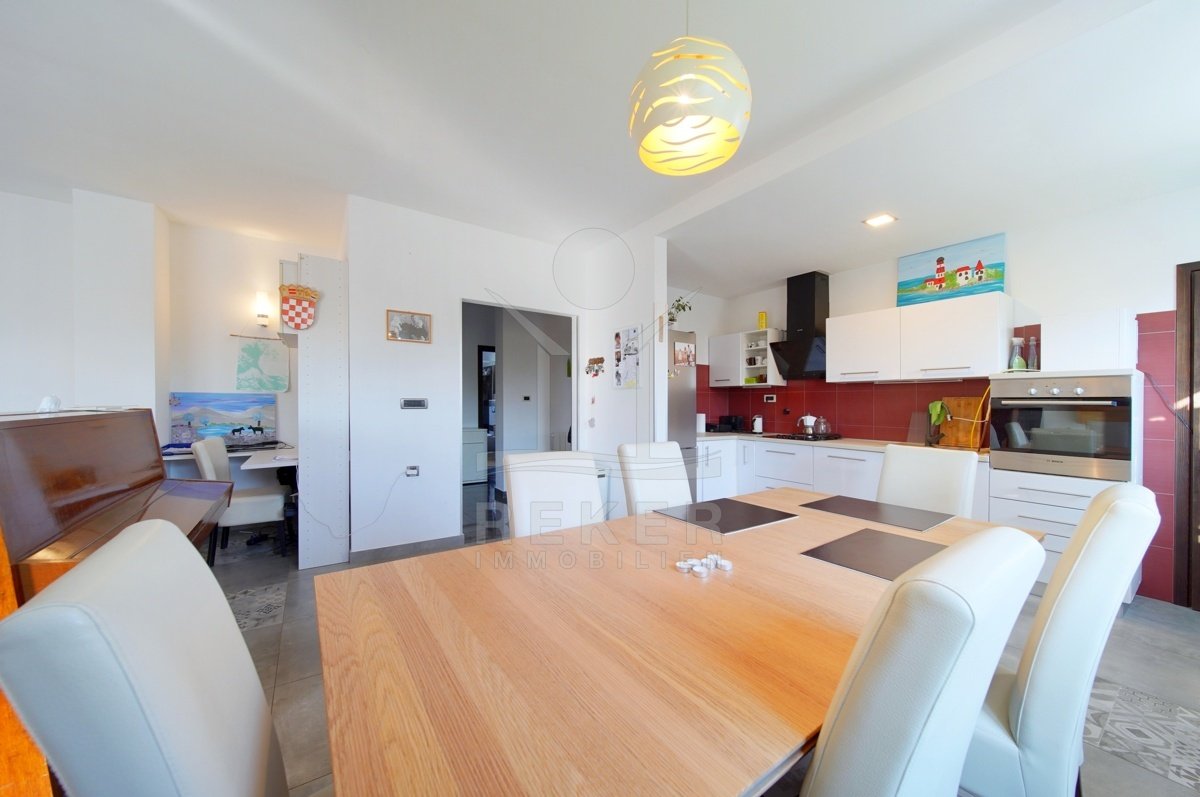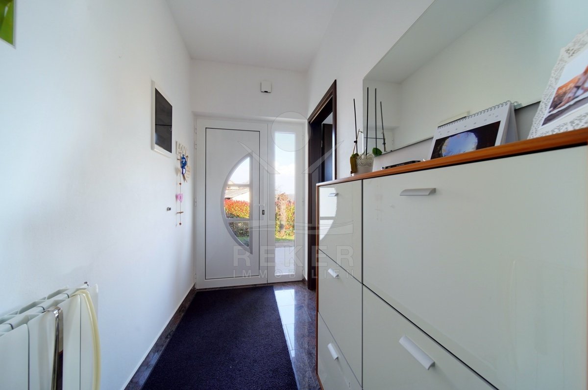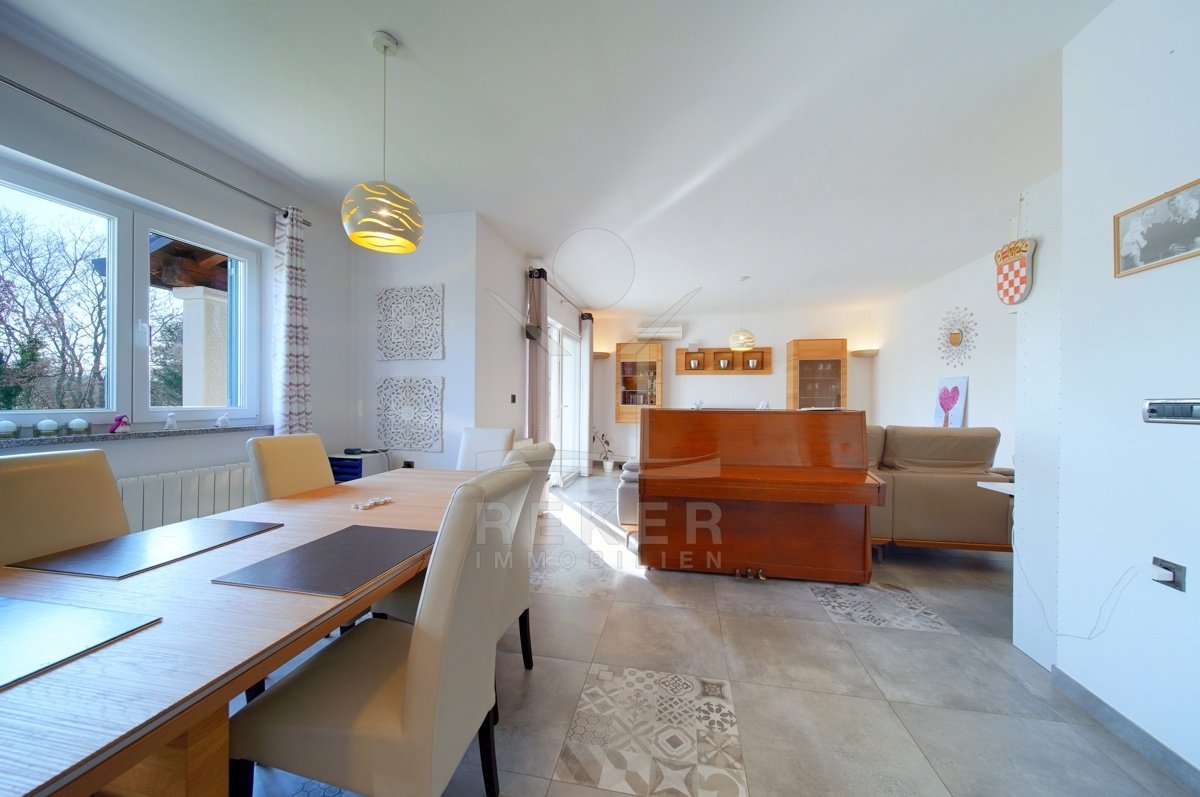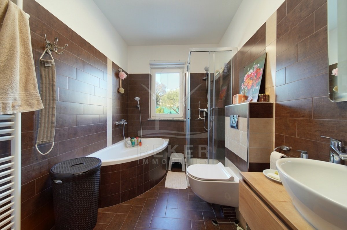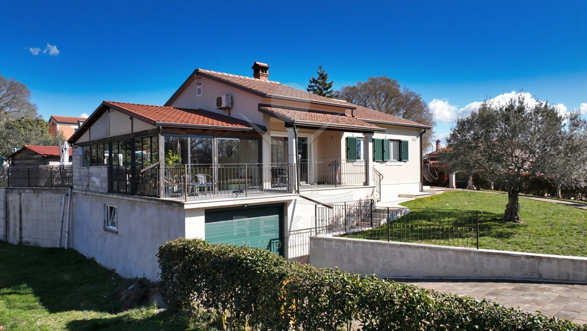 Dieses Familienhaus bei Tinjan bietet Ihnen Ruhe, Weitblick und viel Platz. Sie wohnen etwa 6 km vom Ort entfernt auf einem Südhang mit Blick über grüne Hügel. Die Ausrichtung bringt viel Tageslicht ins Haus und schafft eine freundliche Atmosphäre. Das Meer und die Strände erreichen Sie nach rund 21 km. Die Zufahrt ist asphaltiert. So kommen Sie bequem an. Ihr Fahrzeug parken Sie direkt auf dem Grundstück. In der Garage im Untergeschoss oder unter dem überdachten Stellplatz für zwei Autos.