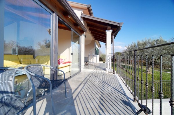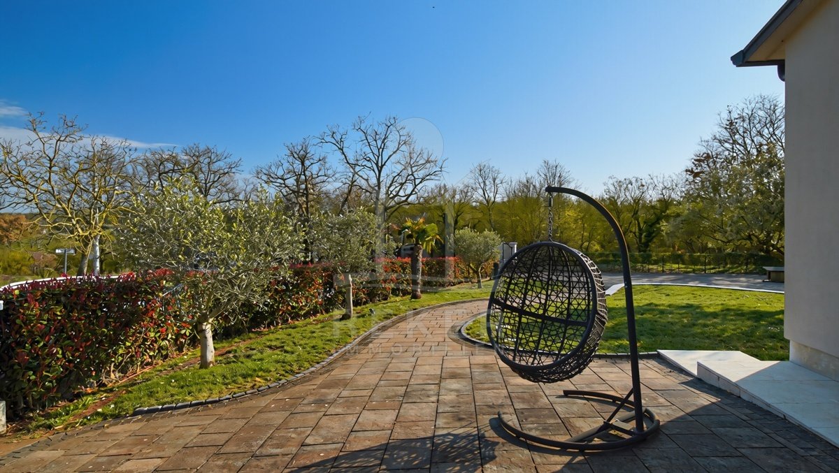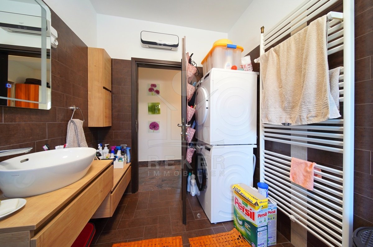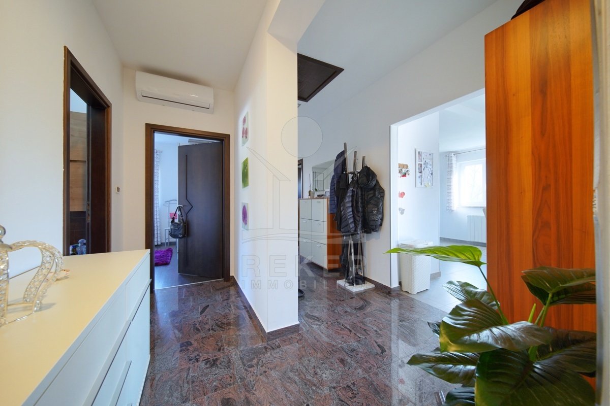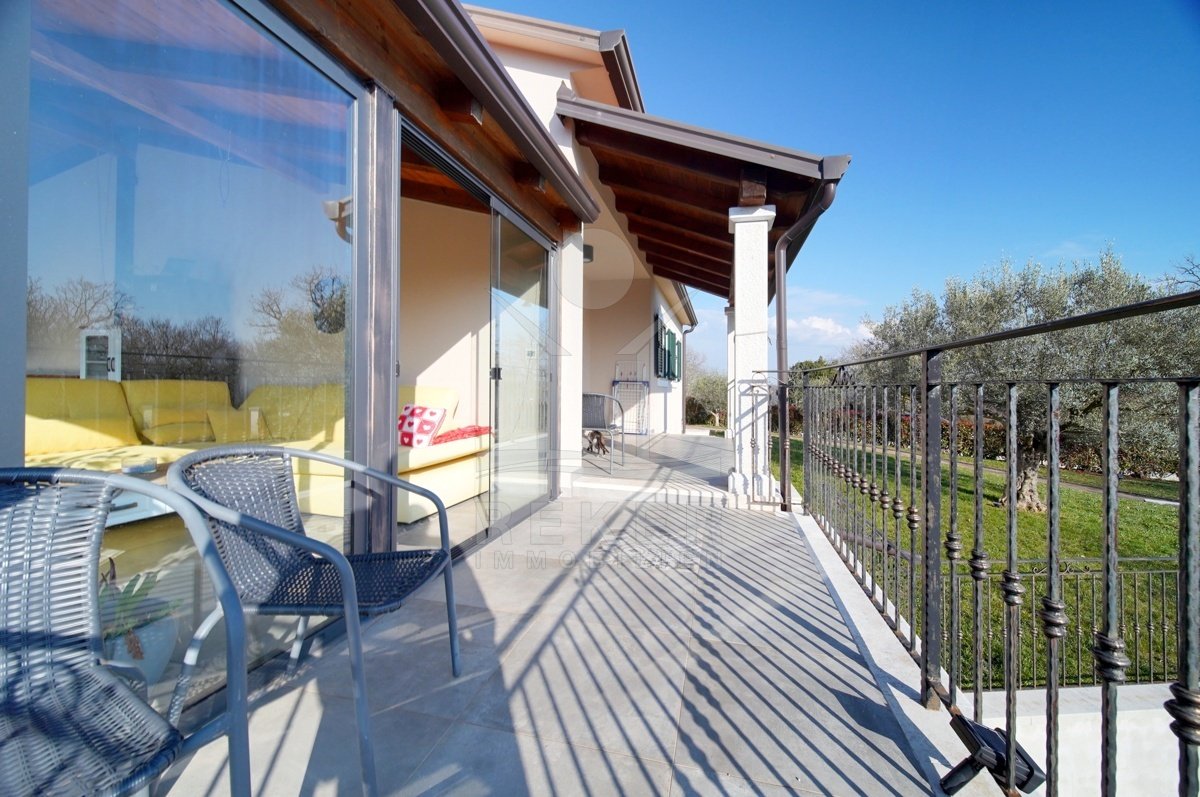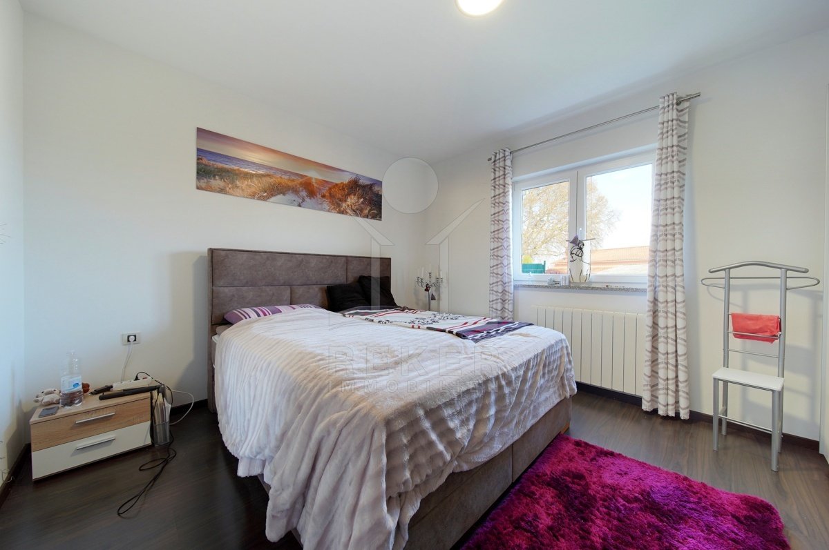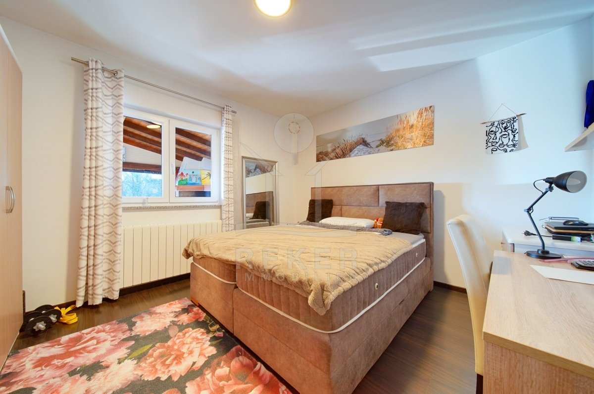 Dieses Familienhaus bei Tinjan bietet Ihnen Ruhe, Weitblick und viel Platz. Sie wohnen etwa 6 km vom Ort entfernt auf einem Südhang mit Blick über grüne Hügel. Die Ausrichtung bringt viel Tageslicht ins Haus und schafft eine freundliche Atmosphäre. Das Meer und die Strände erreichen Sie nach rund 21 km. Die Zufahrt ist asphaltiert. So kommen Sie bequem an. Ihr Fahrzeug parken Sie direkt auf dem Grundstück. In der Garage im Untergeschoss oder unter dem überdachten Stellplatz für zwei Autos.