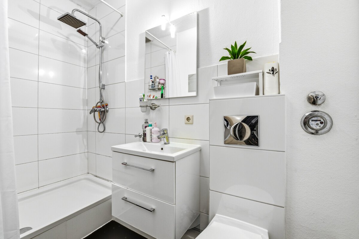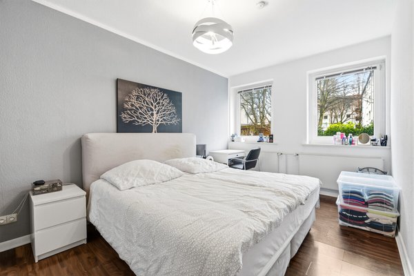 Das Schlafzimmer verfügt über zwei Fenster und bietet vielfältige Stellmöglichkeiten. Das Duschbad ist ebenfalls modern gestaltet und hell gefliest, was den freundlichen Gesamteindruck der Wohnung unterstreicht.