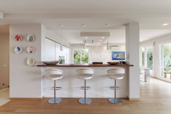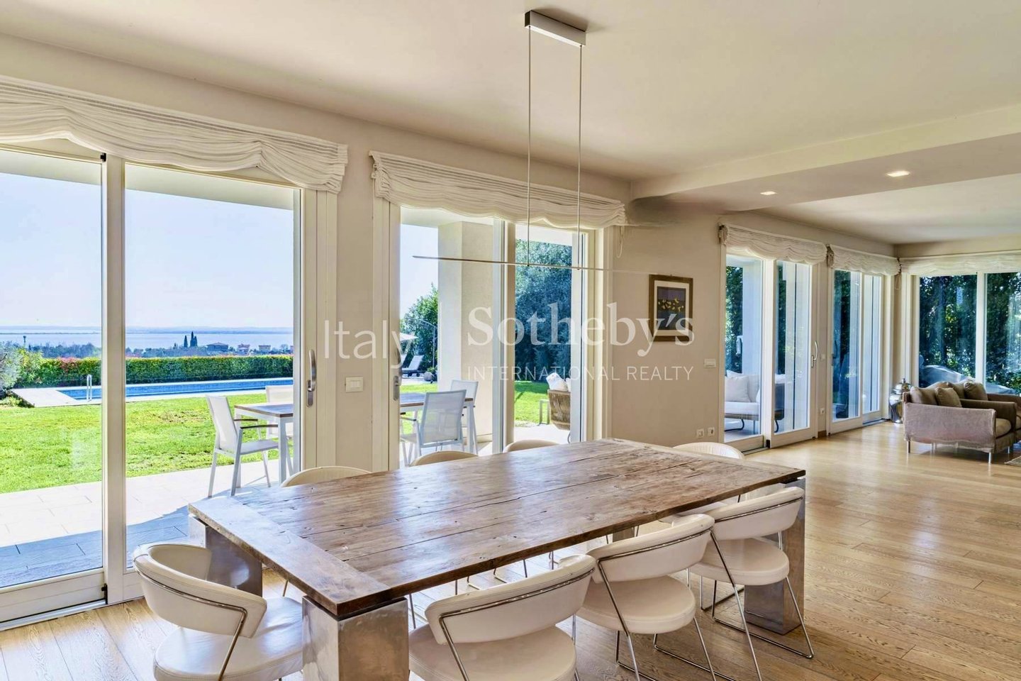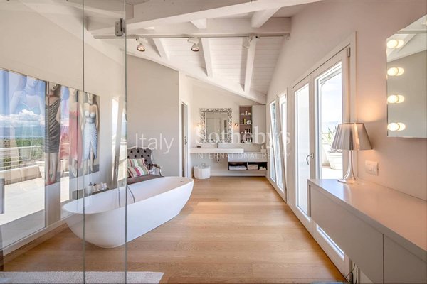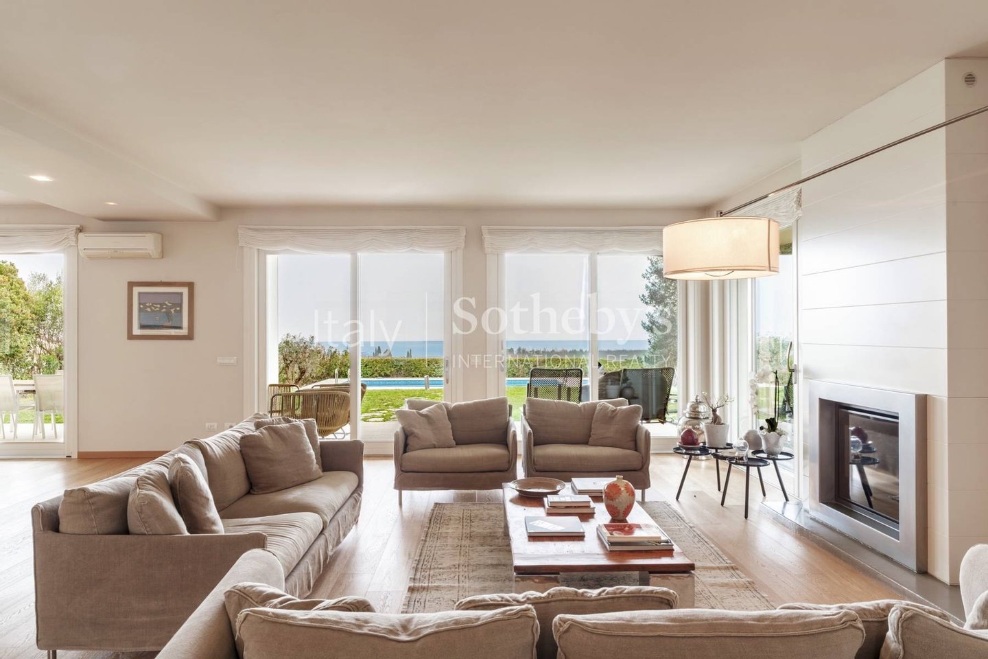 In Soiano del Lago, within one of Lake Garda's most exclusive residential enclaves, this elegant villa enjoys an elevated position with sweeping views extending from the Sirmione peninsula across the lake to the iconic silhouette of Monte Baldo.The interi