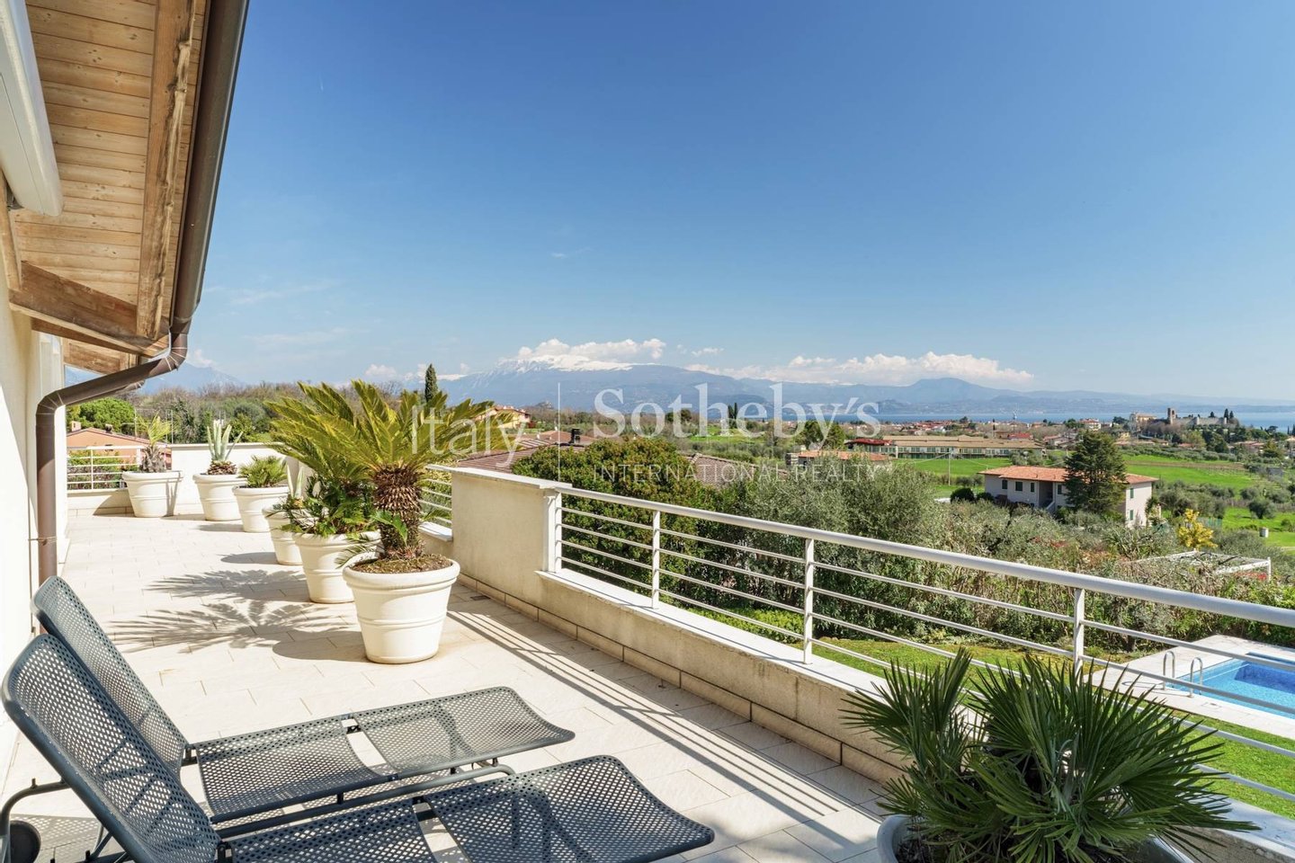 In Soiano del Lago, within one of Lake Garda's most exclusive residential enclaves, this elegant villa enjoys an elevated position with sweeping views extending from the Sirmione peninsula across the lake to the iconic silhouette of Monte Baldo.