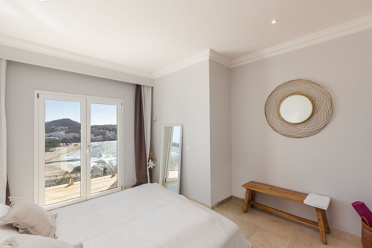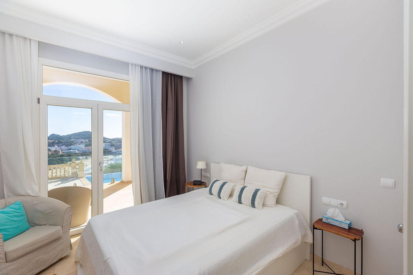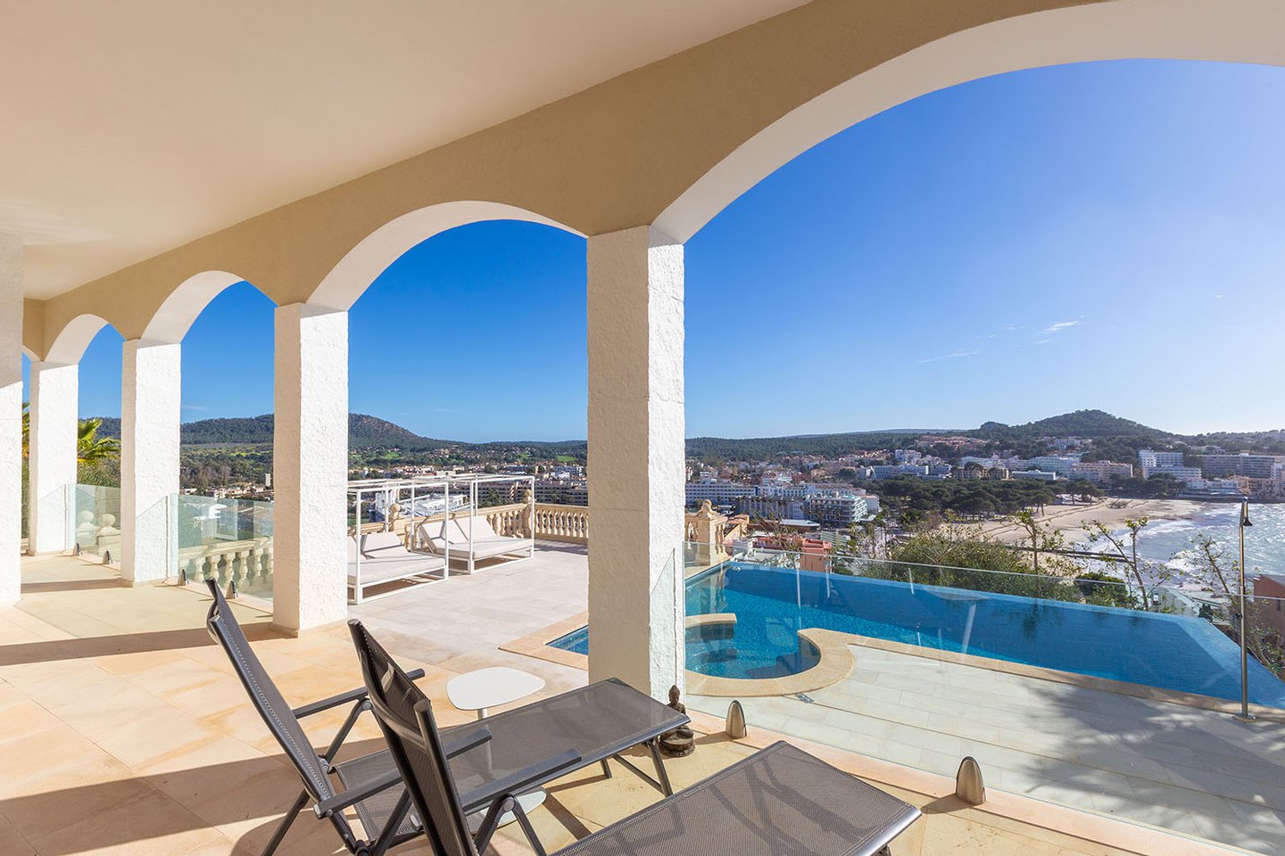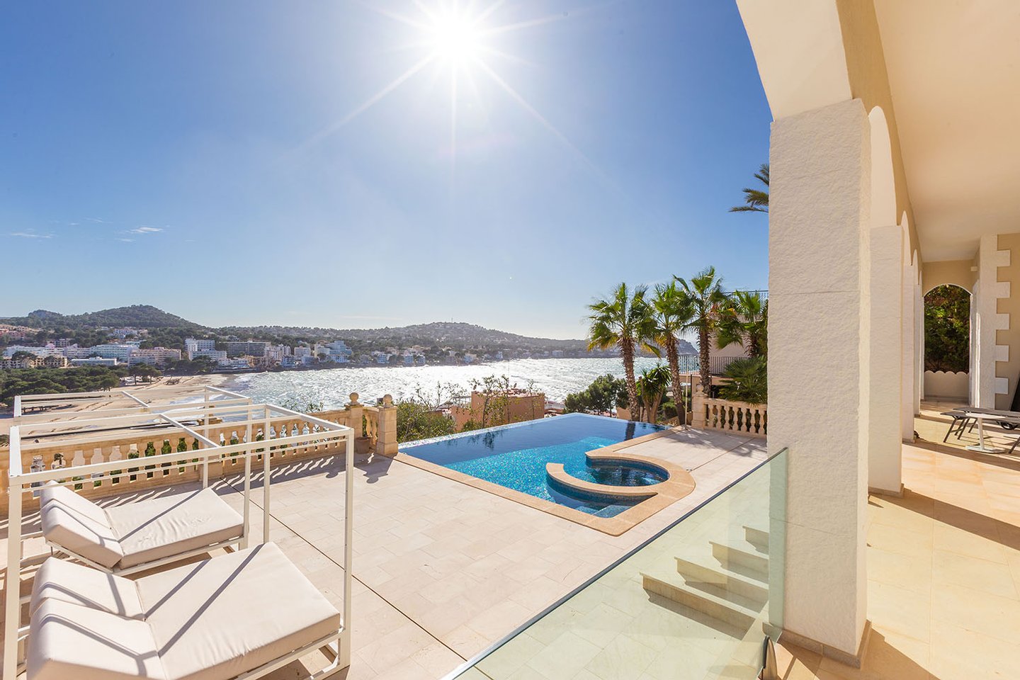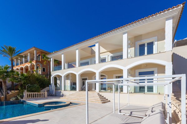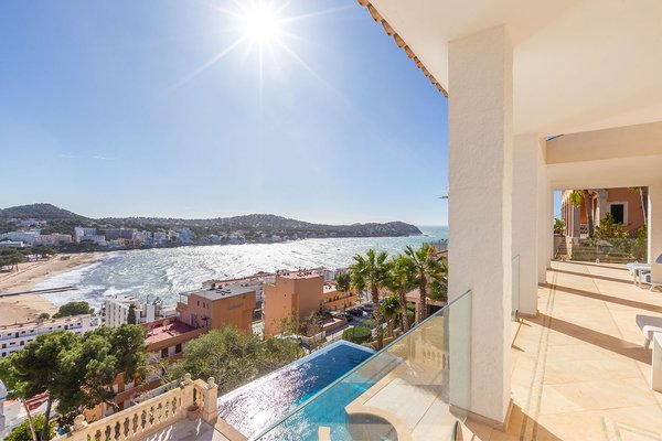 Diese sonnige Villa besticht durch ihre hervorragende Lage oberhalb der Bucht von Santa Ponsa und eröffnet einen unvergleichlichen Panoramablick auf das Meer, die umliegenden Berge und den Strand. Die südliche Ausrichtung sorgt für optimale Lichtverhältnisse und zahlreiche Sonnenstunden. Vor Kurzem wurde die Immobilie umfassend modernisiert und hochwertig ausgestattet. Dabei verbinden sich mediterrane Architekturelemente harmonisch mit klaren, zeitgemäßen Linien und verleihen dem Anwesen ein stilvolles und zugleich einladendes Ambiente.