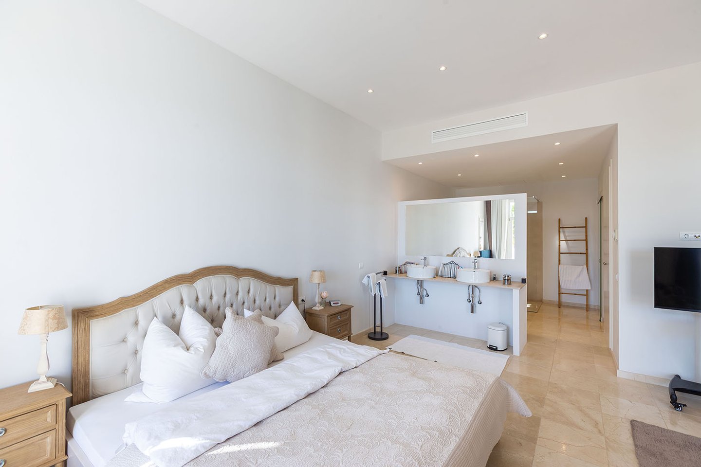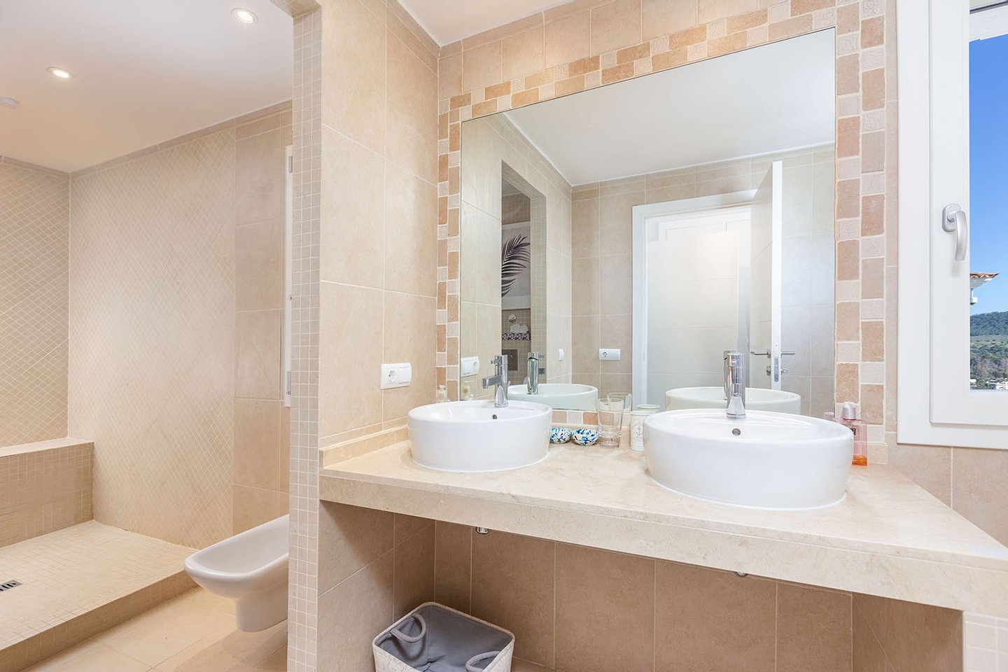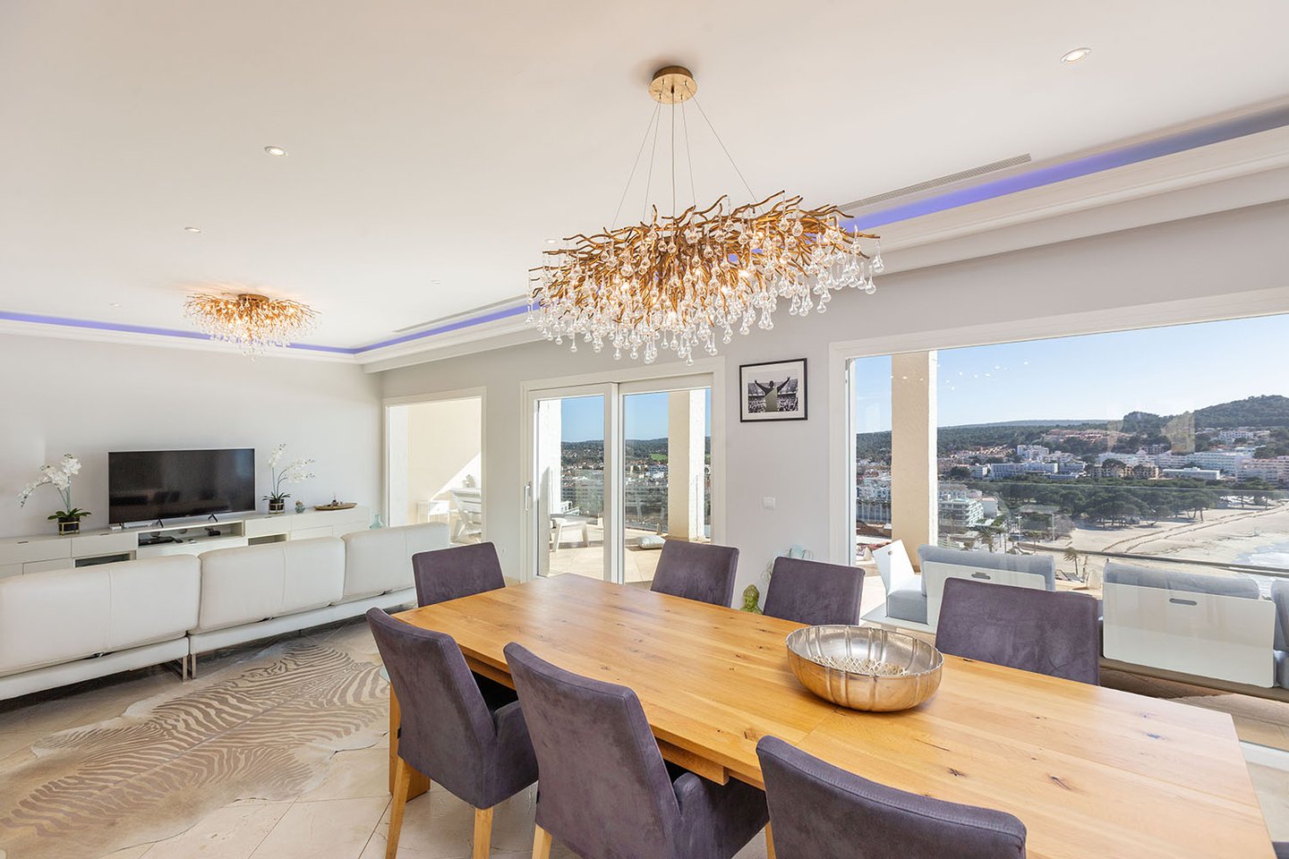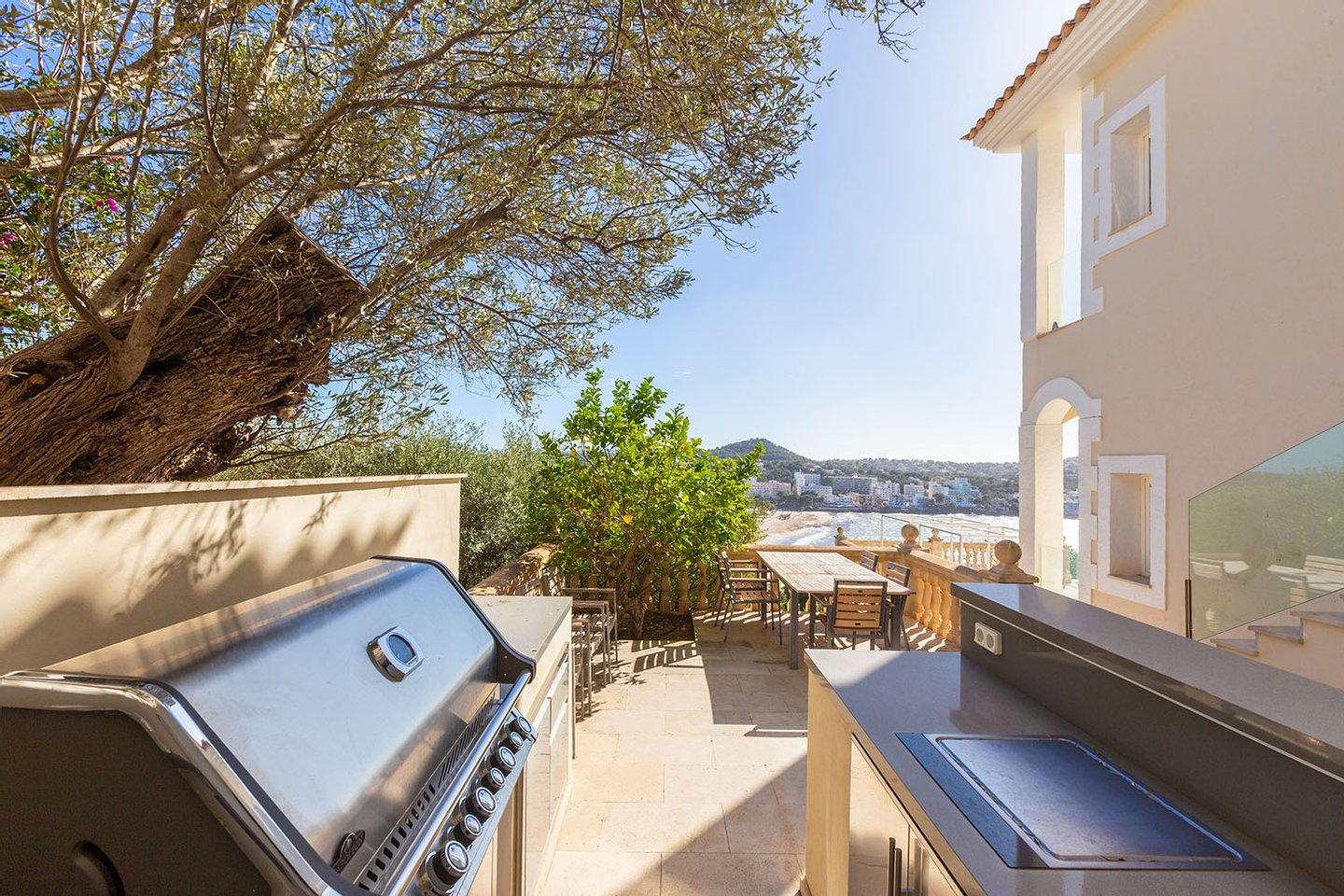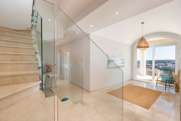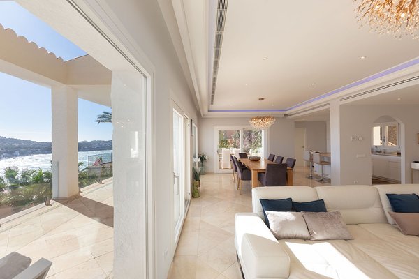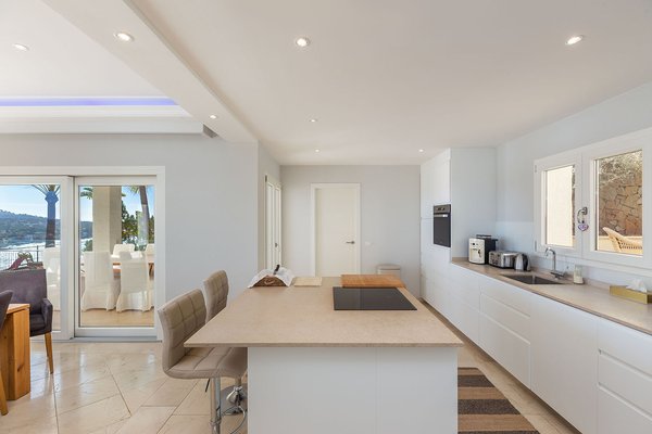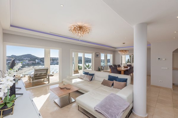 Die Villa befindet sich auf einem rund 1.388 m² großen Grundstück und erstreckt sich über zwei Ebenen. Herzstück ist der großzügige Wohnbereich mit beeindruckendem Blick über die Bucht. Eine offene, vollständig ausgestattete Küche fügt sich nahtlos in das Raumkonzept ein. Von hier aus gelangt man auf eine weitläufige, überdachte Terrasse, die einen spektakulären Ausblick bietet und zusätzlichen Lebensraum im Freien schafft.