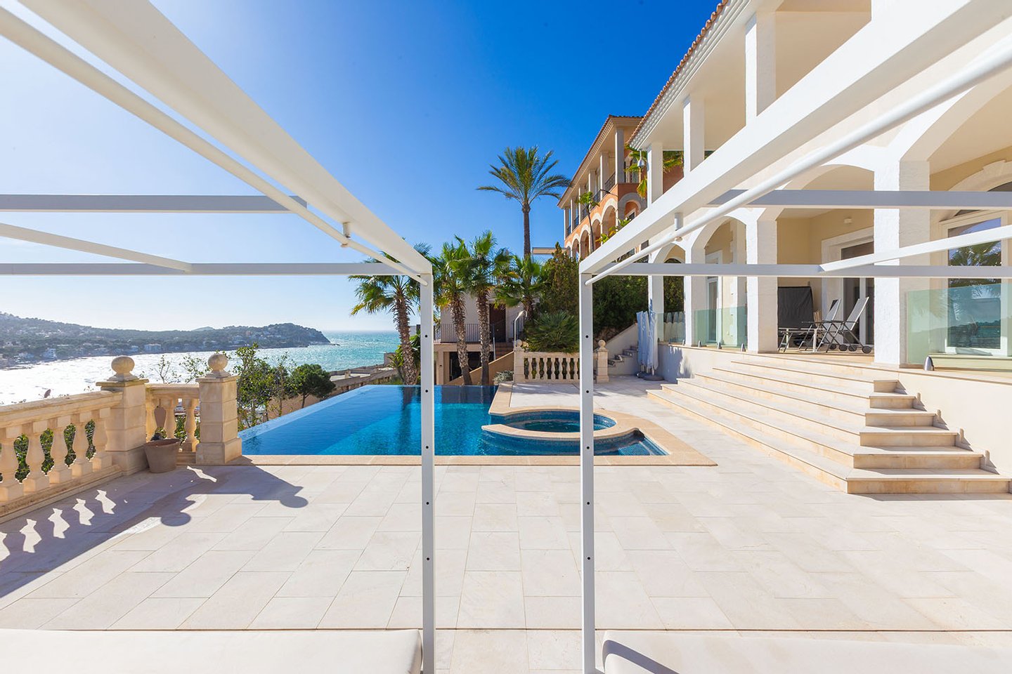 Edle Materialien wie naturfarbener Marmor unterstreichen den gehobenen Anspruch der Immobilie. Fußbodenheizung und Klimaanlage gewährleisten ganzjährig ein angenehmes Raumklima. Ergänzt wird das Raumangebot durch mehrere Kellerräume sowie zwei Carport-Stellplätze auf dem Grundstück. Verschiedene offene und überdachte Terrassenflächen, ein Infinity-Pool und eine Sommerküche mit Essbereich laden dazu ein, das mediterrane Lebensgefühl in vollen Zügen zu genießen. Von nahezu jeder Ebene aus eröffnet sich ein weiter Blick über das Meer.