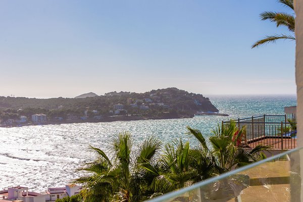 Diese sonnige Villa besticht durch ihre hervorragende Lage oberhalb der Bucht von Santa Ponsa und eröffnet einen unvergleichlichen Panoramablick auf das Meer, die umliegenden Berge und den Strand. Die südliche Ausrichtung sorgt für optimale