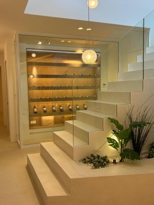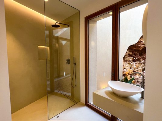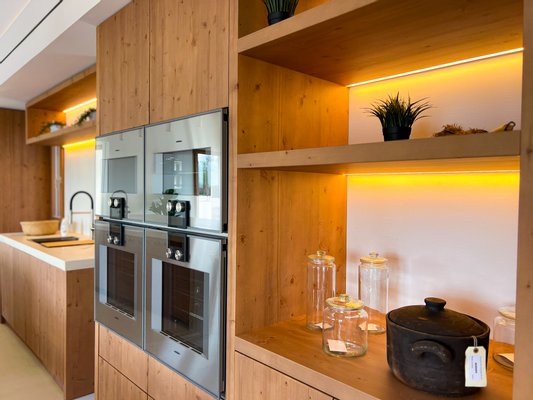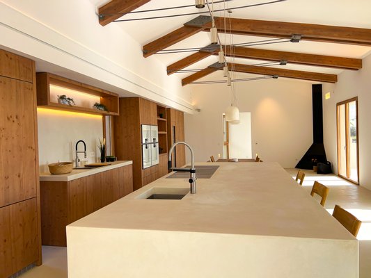 Kalkputz, Naturstein- und Microzementflächen, hochwertige Holzarbeiten und maßgefertigte Einbauten, individuell gestaltetes Lichtkonzept mit Design-Leuchten sowie ausgewählte künstlerische Details. Doppel-Seiten-Kamin (Innen- und Außenbereich) und hochwertige Küche mit Geräten von Gaggenau, BORA und Blanco.