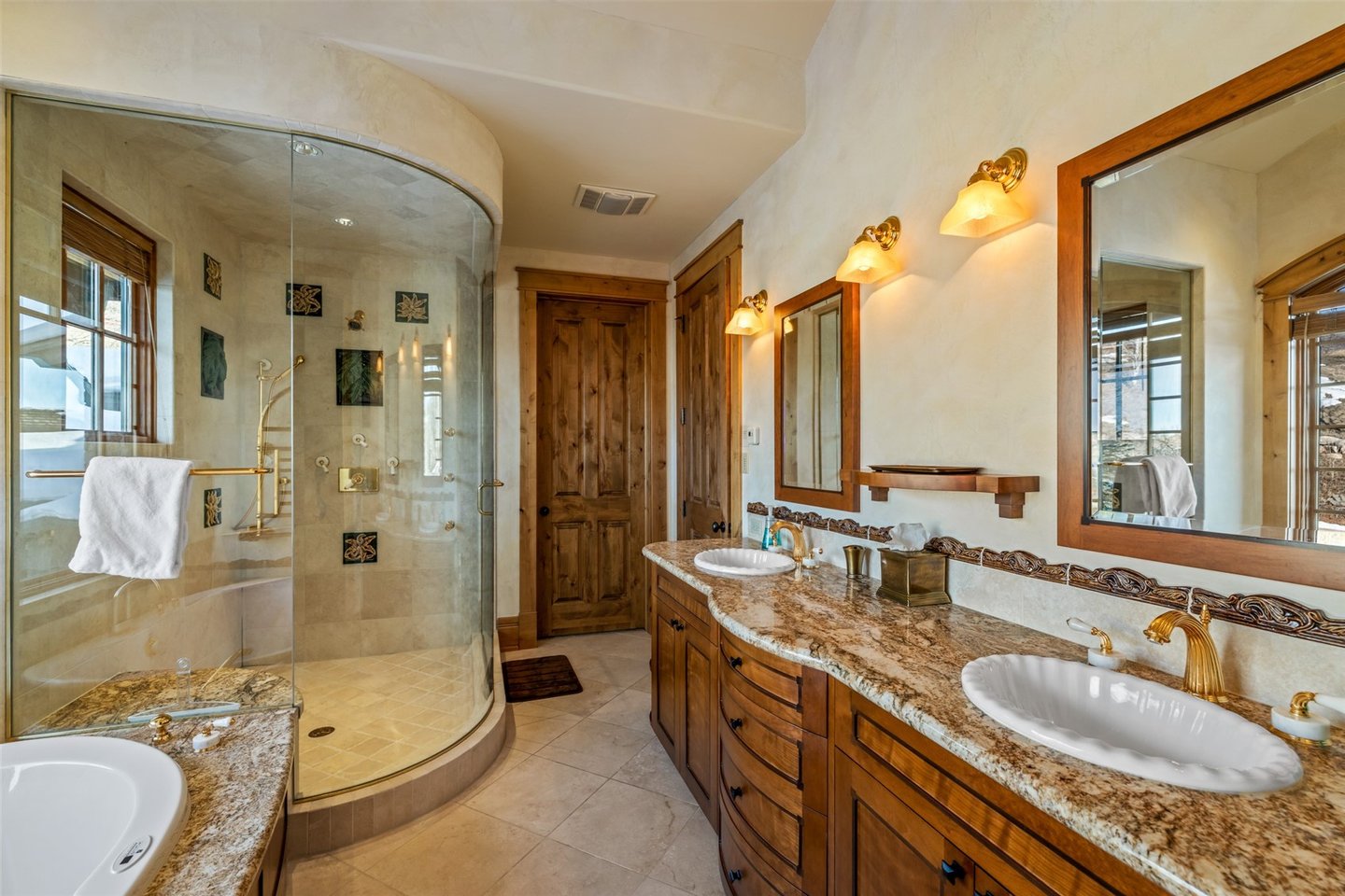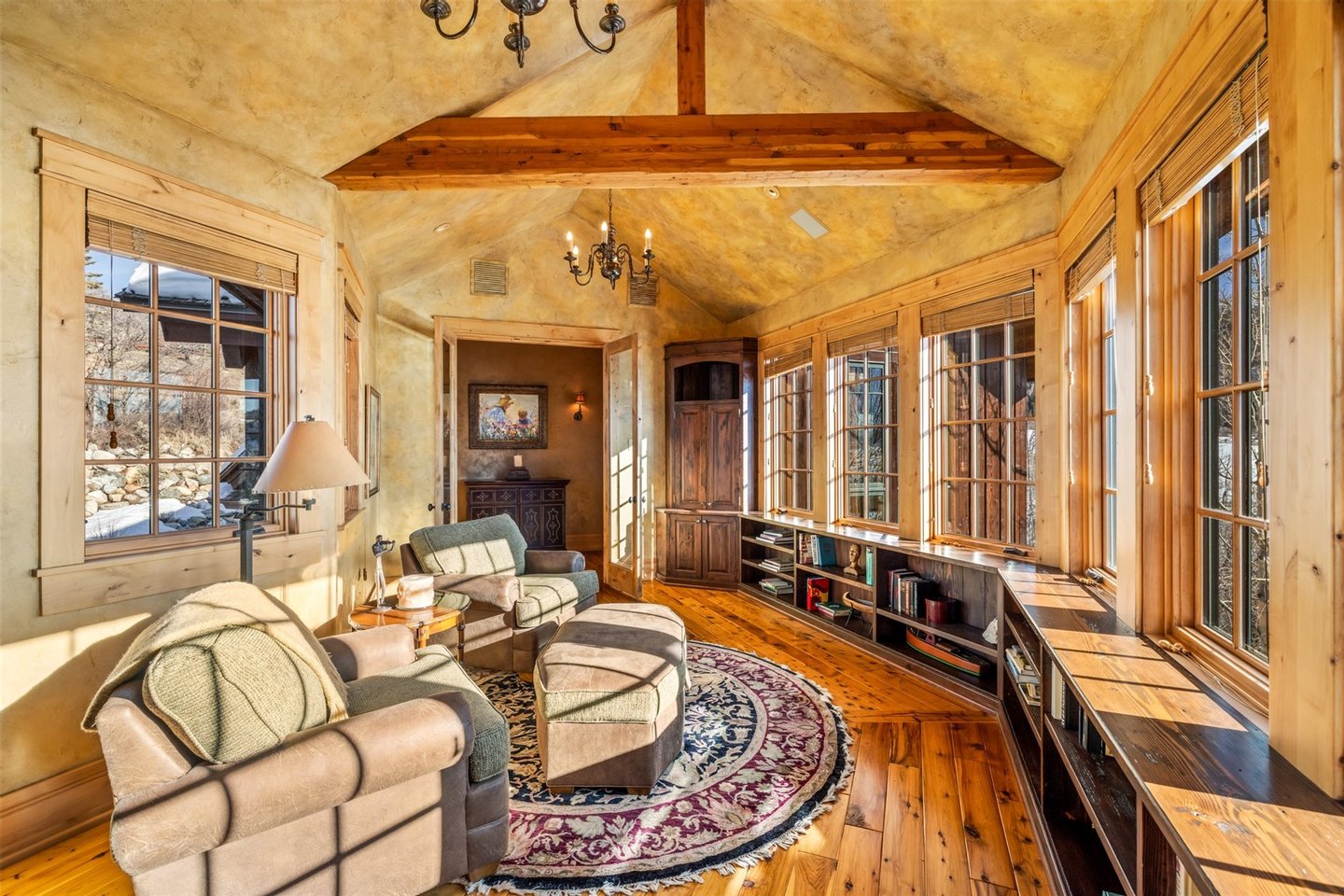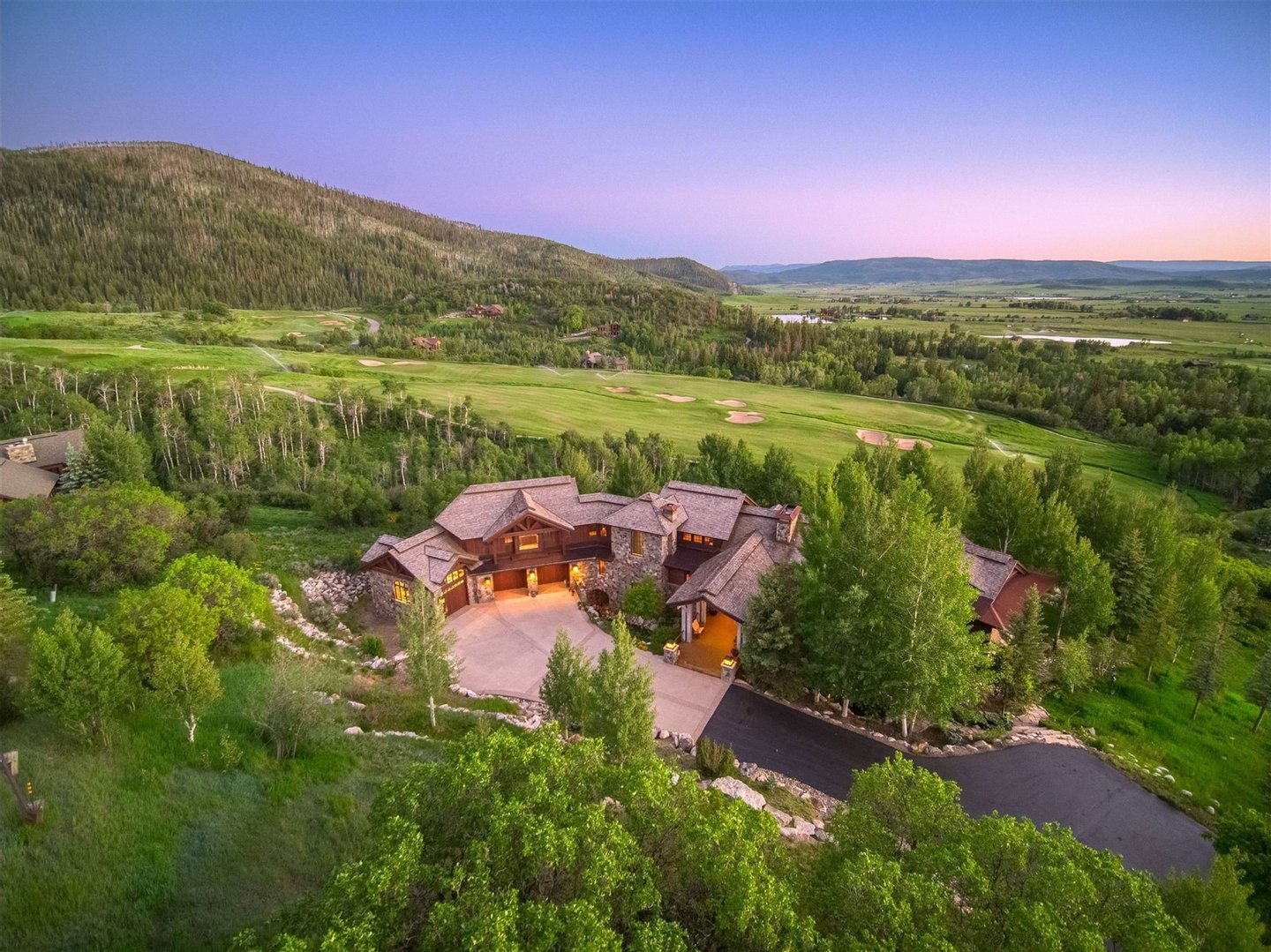 Set on 7 private acres overlooking the 7th fairway of Catamount Ranch & Club, the Covered Bridge Estate is one of Steamboat Springs’ most architecturally significant residences, with sweeping South Valley and mountain views. Designed by architect Joe Patrick Robbins and meticulously constructed over three years, the home is offered fully furnished and reflects an exceptional level of craftsmanship, scale, and material depth. Named for its signature covered bridge entry, the residence blends European influence with hand-built stone and timber construction, featuring oak, pecan, and pine flooring and 400 tons of natural stone throughout. Vaulted 30-foot ceilings soar above the great room, featuring a full-height stone wall with fireplace, one of 5 throughout the home, extending to an outdoor terrace with sweeping views. The newly remodeled chef’s kitchen includes a prep area, expansive center island, dual appliances, built-in Miele coffee system, breakfast nook with panoramic views, an adjacent hearth room and outdoor grilling deck. Designed for true main-level living, the primary suite with partner baths and dressing rooms, office/library, kitchen, dining, and living areas are all on the first floor. Additional bedrooms, including a second ultra-private primary, include ensuite baths and private patios, ideal for guests or multi-generational living. Designed for entertaining and wellness, the ground floor features an exquisite wine cellar, 10-seat home theater, expansive game and living room with a fireplace and bar, fitness studio, and spa with steam shower, sauna, cold plunge, and dual baths. Outdoor spaces include multiple terraces, landscaped gardens, cascading water features, a snowmelt driveway, and a 4-car garage. Located minutes from the Steamboat Ski Resort and downtown, The Covered Bridge Estate offers architectural distinction, privacy, and enduring craftsmanship in one of Steamboat’s most coveted settings. Seller financing available. BTC accepted