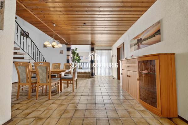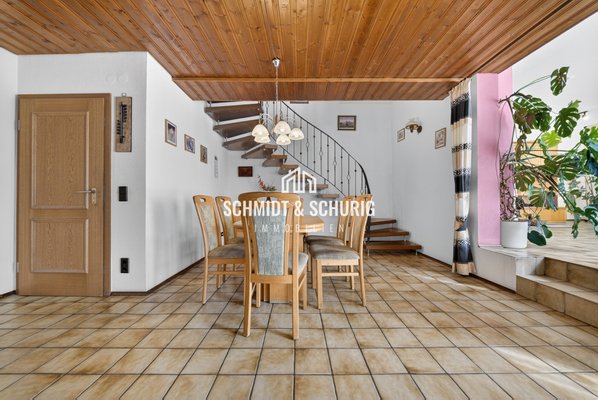 - Offener Esszimmerbereich mit freitragender Holztreppe in das Obergeschoss