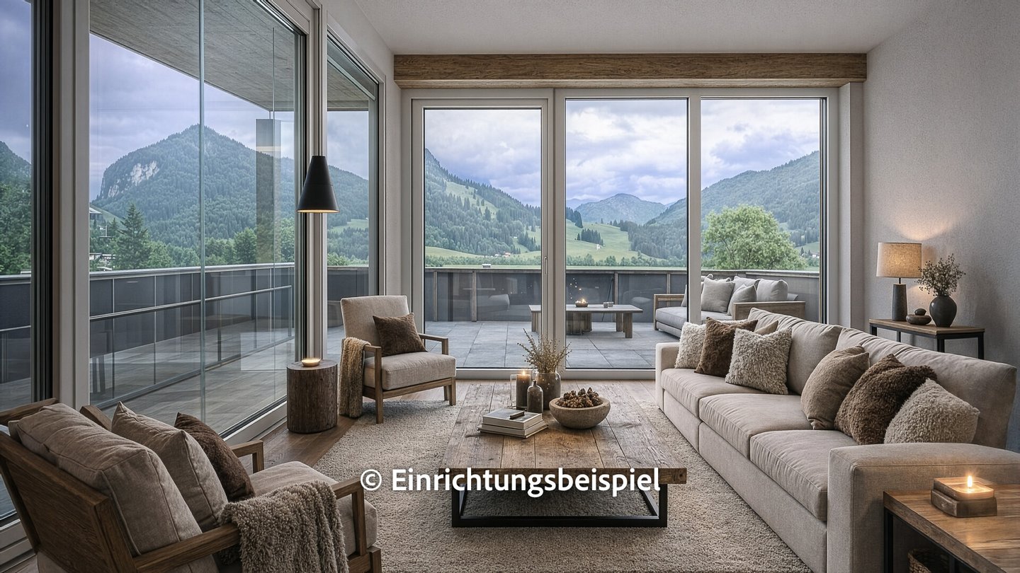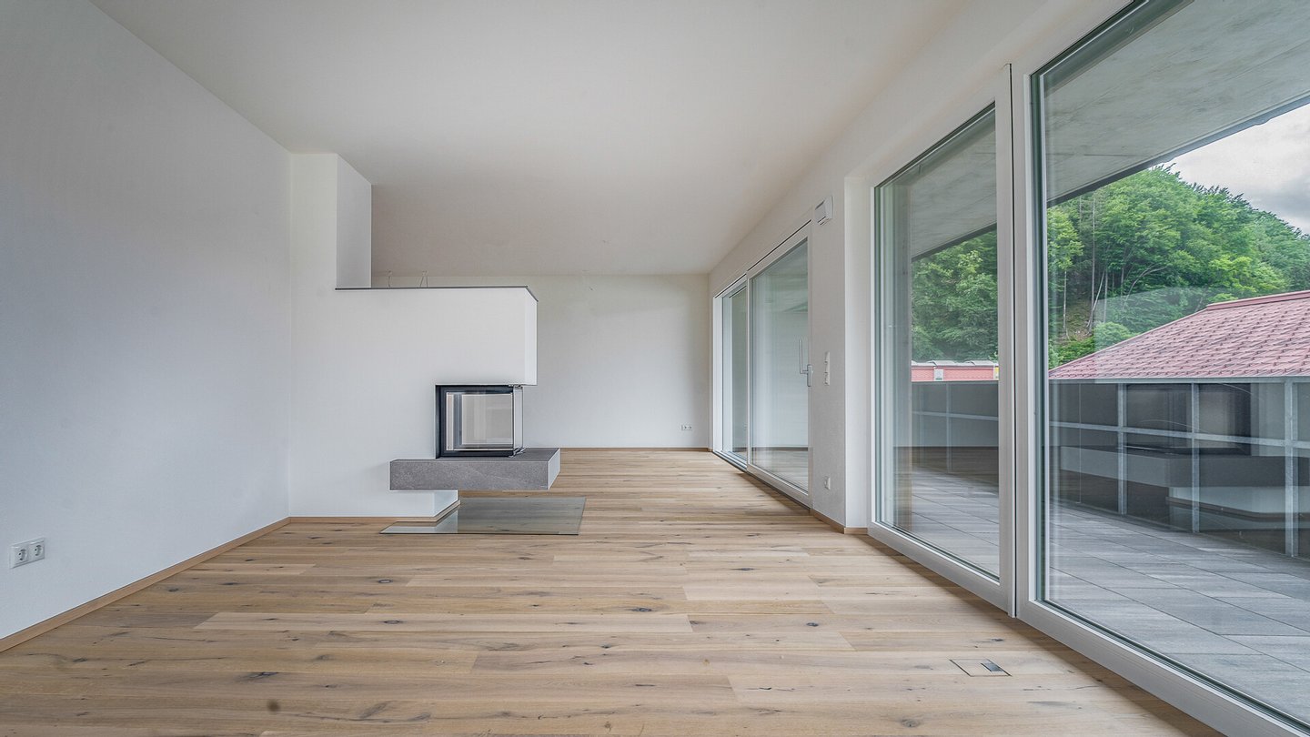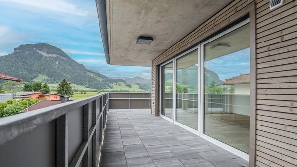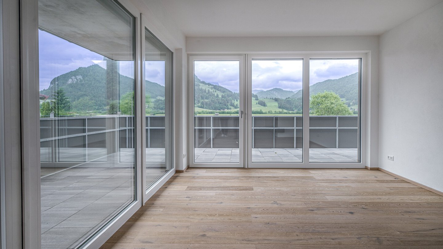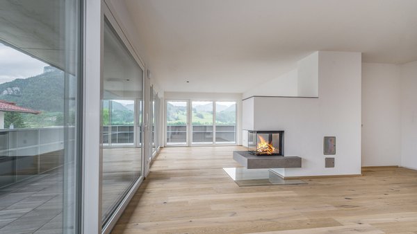 Highlight des Apartments ist der ca. 50 m² große Wohn-Essbereich, dieser besticht vor allem durch die übergroßen Glasfronten und den damit verbunden Panoramablick auf das Kitzbüheler Horn bis hin zum Wilden Kaiser. Auch für eine große Küche ist ausreichend Platz und der mittig angeordnete Kamin dient ideal als Raumteiler.