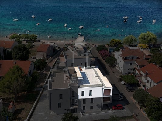 In Vodice, in einem gefragten Ortsteil, wohnen Sie in zweiter Reihe zum Strand. Das Meer erreichen Sie nach 50 Metern, das Zentrum nach rund 600 Metern. Kurze Wege zum Baden, schnelle Erreichbarkeit von Geschäften und Restaurants. Ein eigener Parkplatz gehört zur Wohnung. Das Haus mit nur 8 Einheiten entstand zwischen 2022 und 2023 und schafft eine angenehm private Atmosphäre.