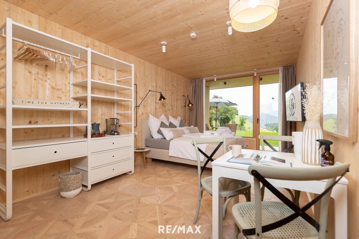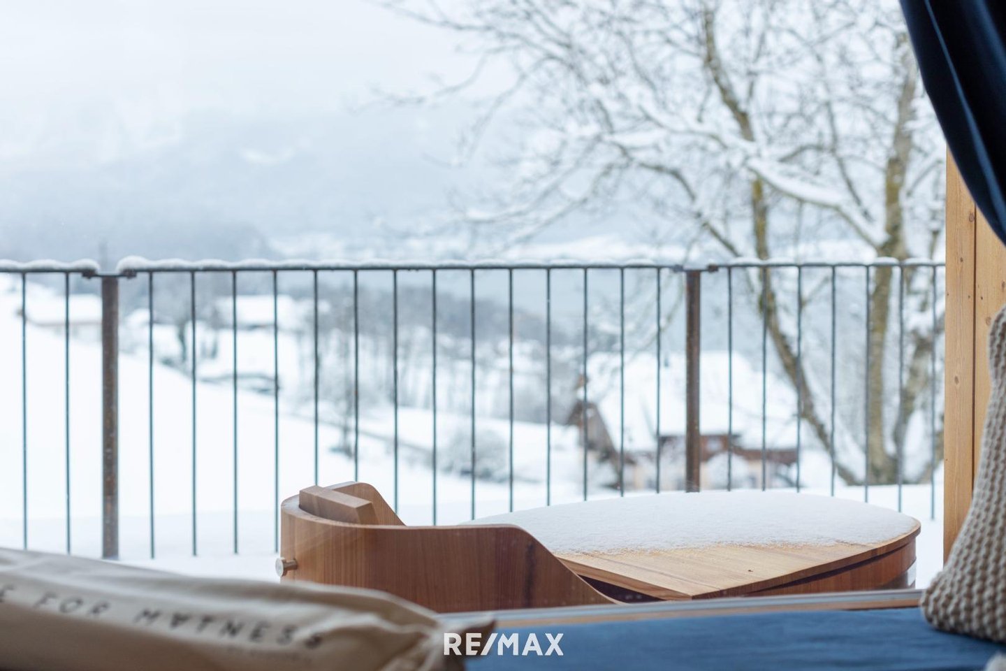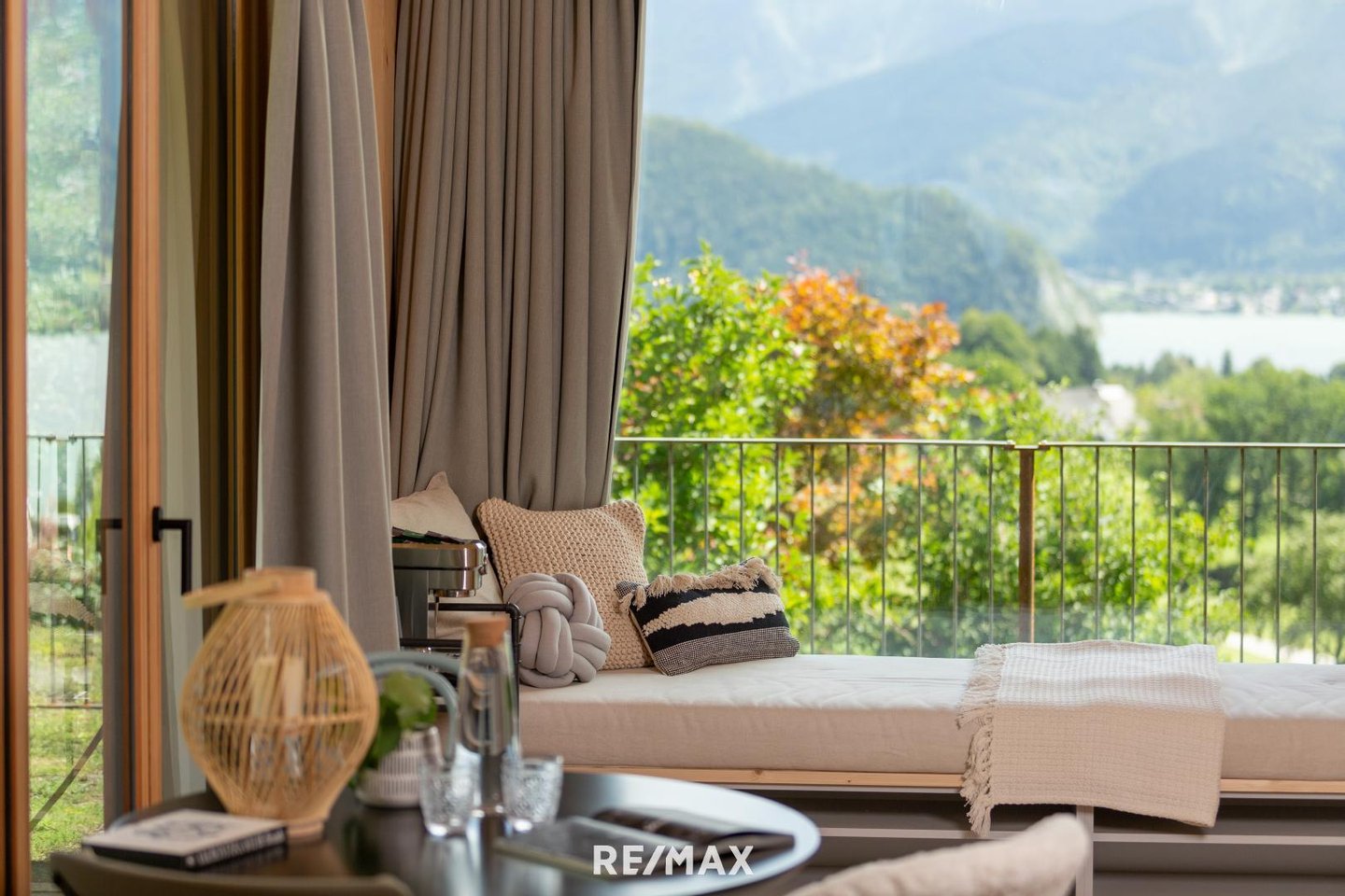 Der Blick über weitreichendes Grünland auf den Wolfgangsee ist allgegenwärtig und prägt das gesamte Wohn- und Aufenthaltsgefühl. Ob von den Apartments, den Terrassen, den Duschen oder den freistehenden Badewannen auf der begrünten Dachterrasse aus – der See wird hier nicht nur gesehen, sondern wurde bewusst ins Wohnkonzept integriert.