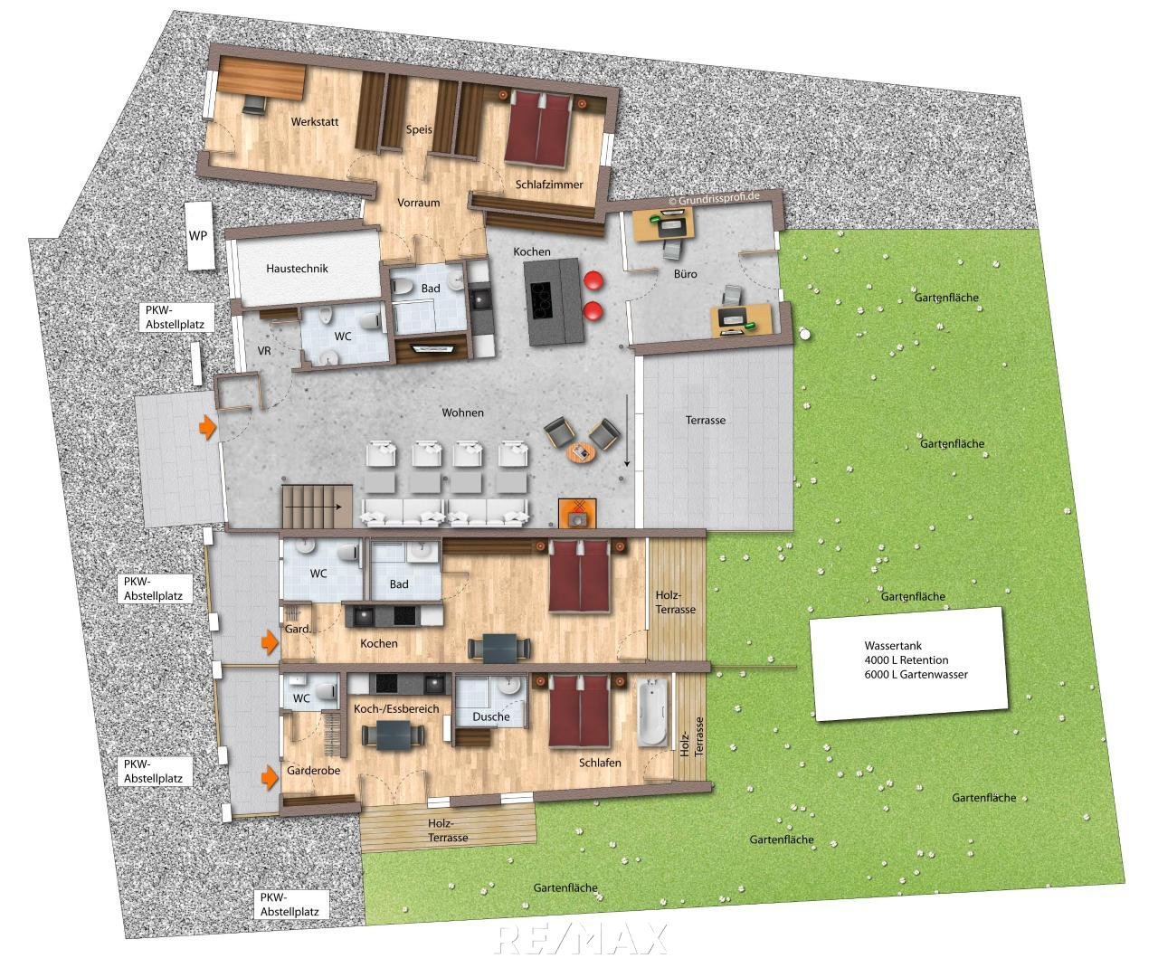 Es wurde auch bei der Errichtung die Möglichkeit geschaffen, das Objekt mit geringem Aufwand als großzügiges Einfamilienhaus mit separat zugänglicher Gästewohnung zu nutzen. Die Liegenschaft wurde ursprünglich mit dem Gedanken geplant, es später selbst zu bewohnen.