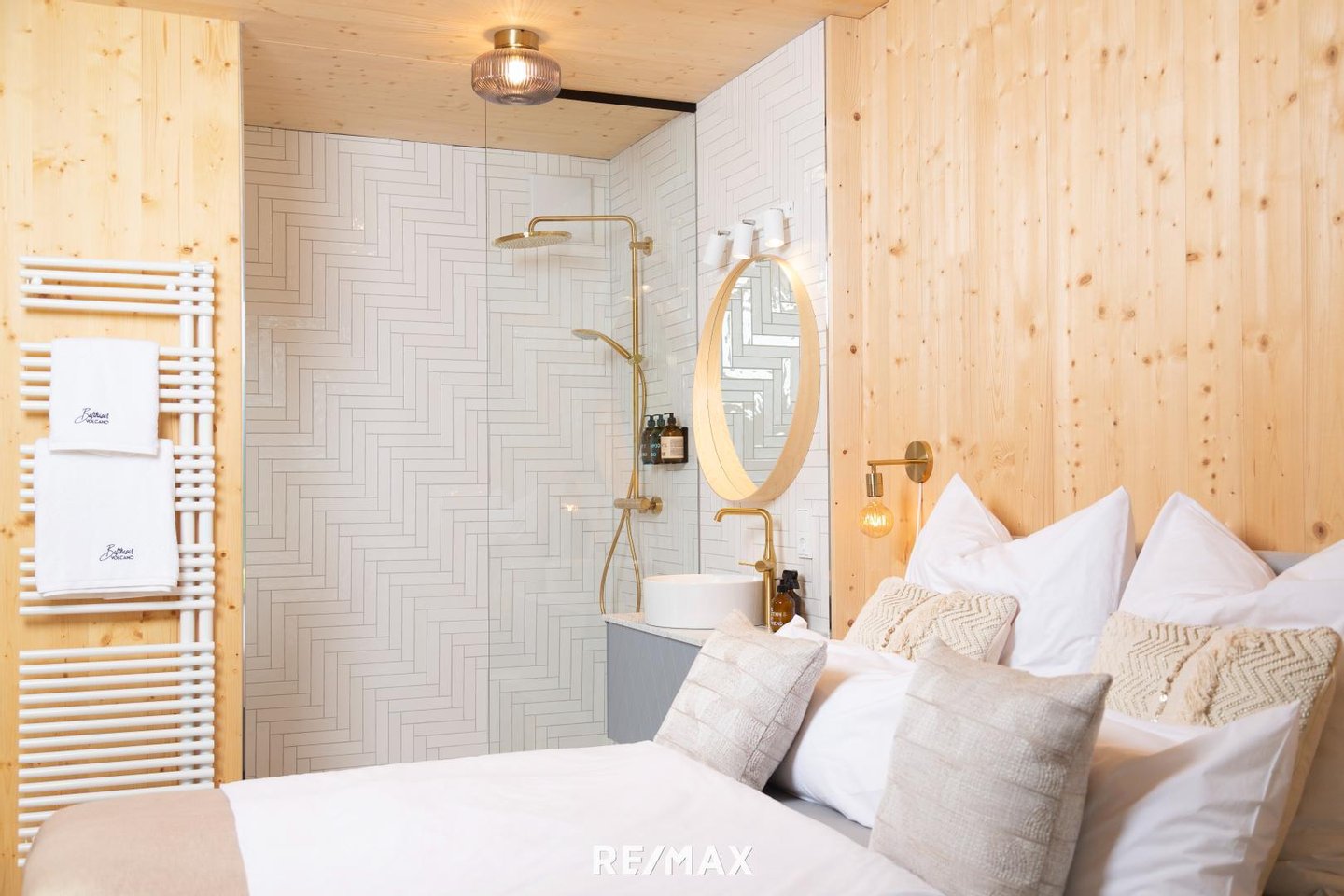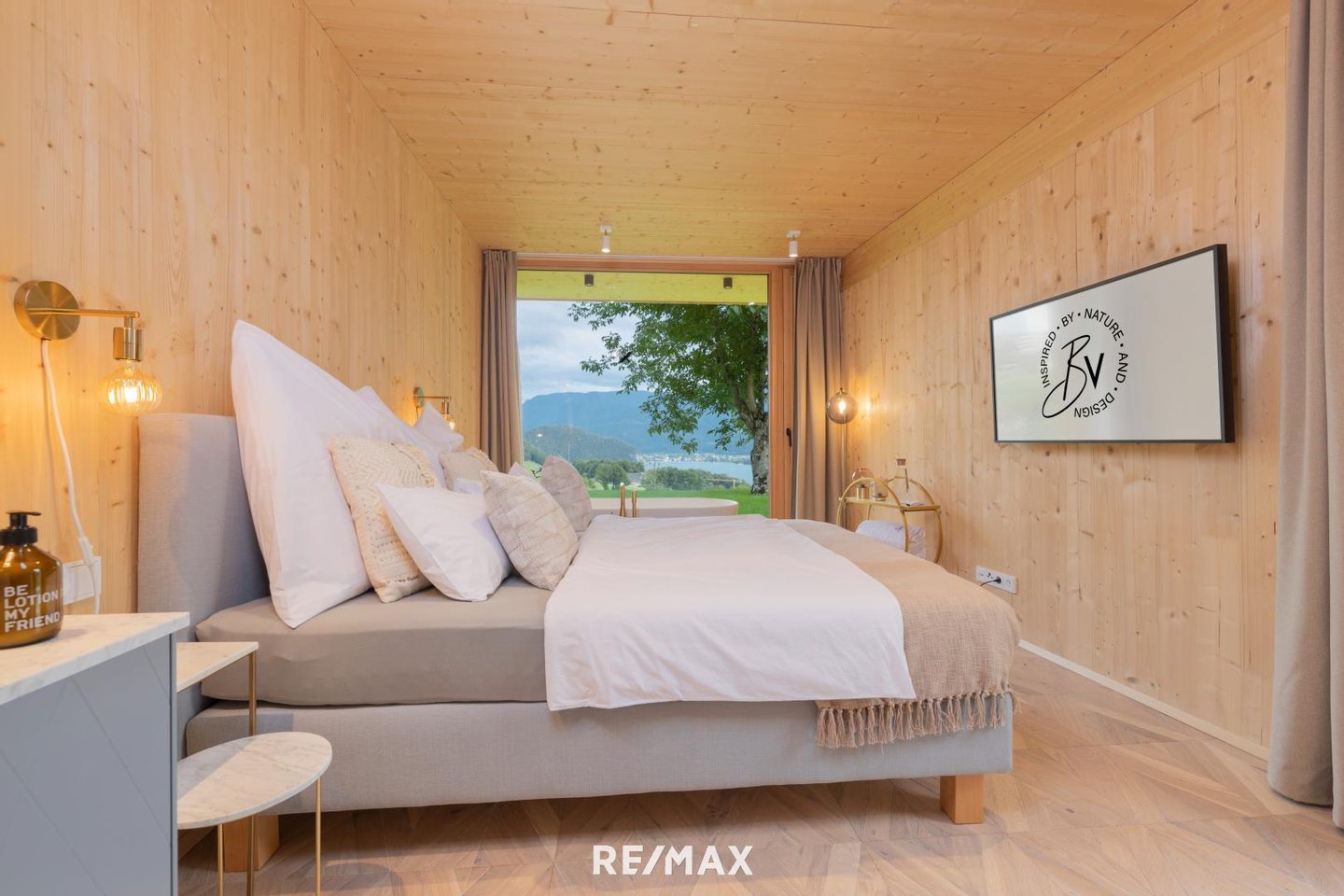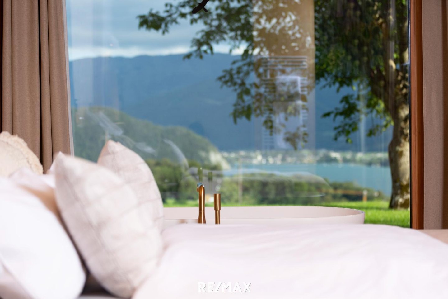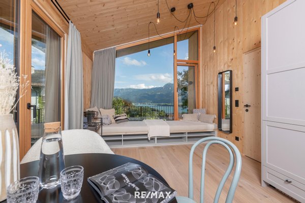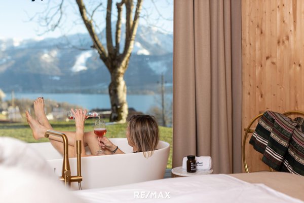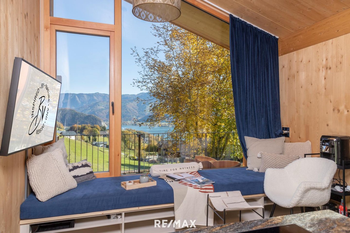 Der Wohn- und Schlafbereich verschmilzt mit dem integrierten Nassbereich zu einer einzigartigen Raumkomposition. Das absolute Highlight ist die freistehende Badewanne direkt vor der großflächigen Panorama-Verglasung – mit freiem Blick auf den Wolfgangsee. Ein Ort, der Ruhe, Luxus und Natur in vollendeter Form verbindet.