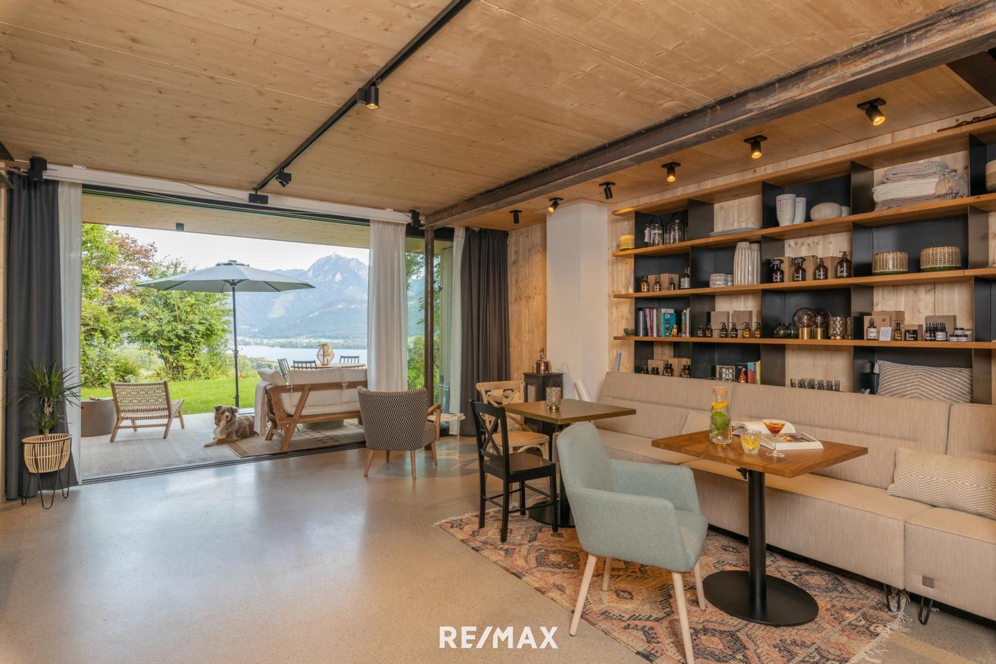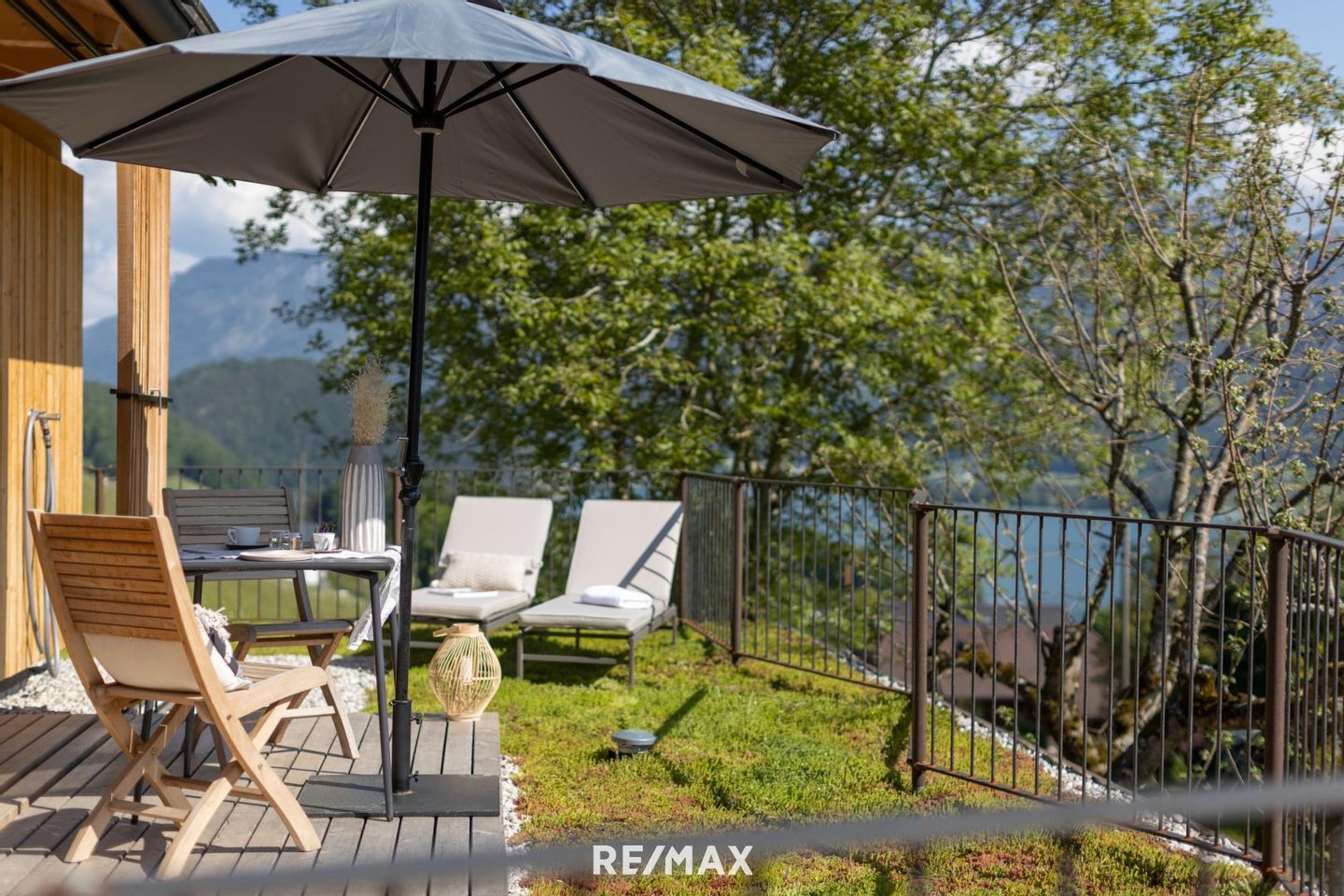 Von hier aus öffnet sich der Zugang zur großen Hauptterrasse, die den Blick weit über den Wolfgangsee schweifen lässt.