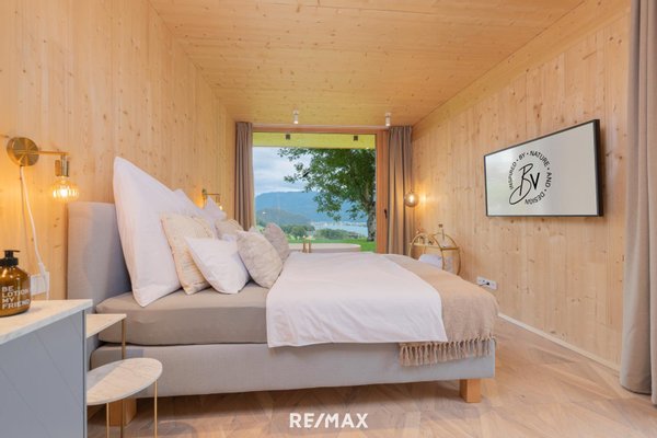 Reduziert, klar und dennoch äußerst wohnlich präsentiert sich der „Minimalist“. Der offene Wohn-, Koch- und Essbereich wird von einer durchgehenden Sitzbank entlang der Panorama-Verglasung begleitet – ein idealer Platz, um den Blick über den See schweifen zu lassen. Die Glasdusche ist direkt in den Raum integriert, der Schlafbereich ist clever durch das separate WC abgetrennt.