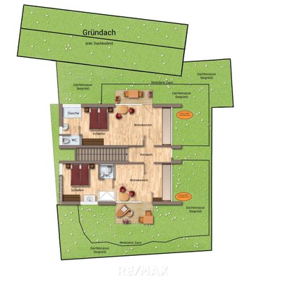 Besonders attraktiv: der Zugang zur nordöstlichen Terrasse sowie zur begrünten Dachterrasse, die zusätzliche Rückzugsorte im Freien schafft.