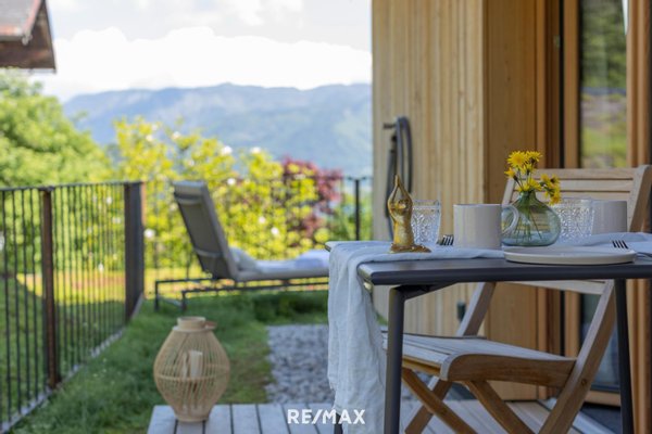 Für beide Apartments im Obergeschoss besteht die Möglichkeit, Holz-Außenbadewannen mit Warmwasser zu nutzen – ein außergewöhnliches Erlebnis mit Blick auf Natur und See. Die großzügige, begrünte Dachterrasse ist weitläufig nutzbar und durch einen ohne Aufwand veränderbaren Metallzaun sicher eingefasst.
