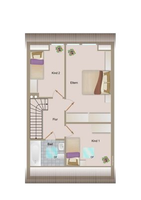 Das Obergeschoss verfügt über drei Schlafzimmer mit Dachschrägen und ein weiteres Badezimmer, welches ebenso nach eigenen Wünschen ausgebaut werden kann.