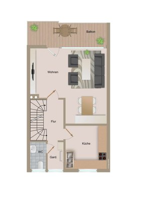 In der ersten Etage erwartet Sie ein großzügiges Wohnzimmer, das mit einem Balkon zusätzlichen Wohnkomfort bietet. Die Küche und das Badezimmer können nach eigenen Wünschen gestaltet werden kann.